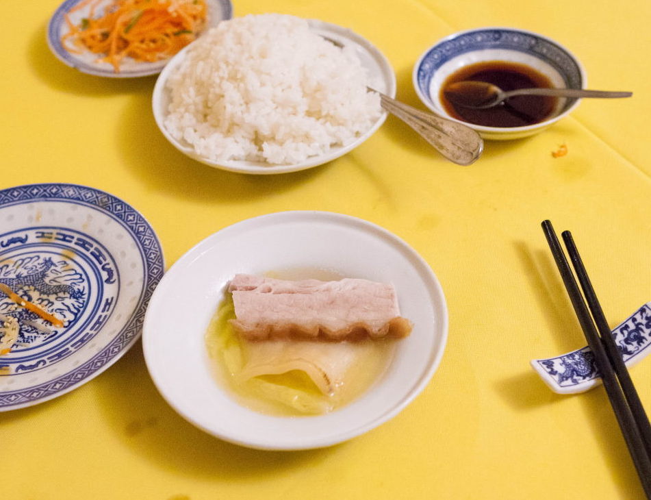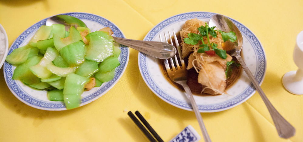 左はチンゲン菜炒め。右は揚げた鱈に中国醤油で作った?秘伝ソースを付けたもの