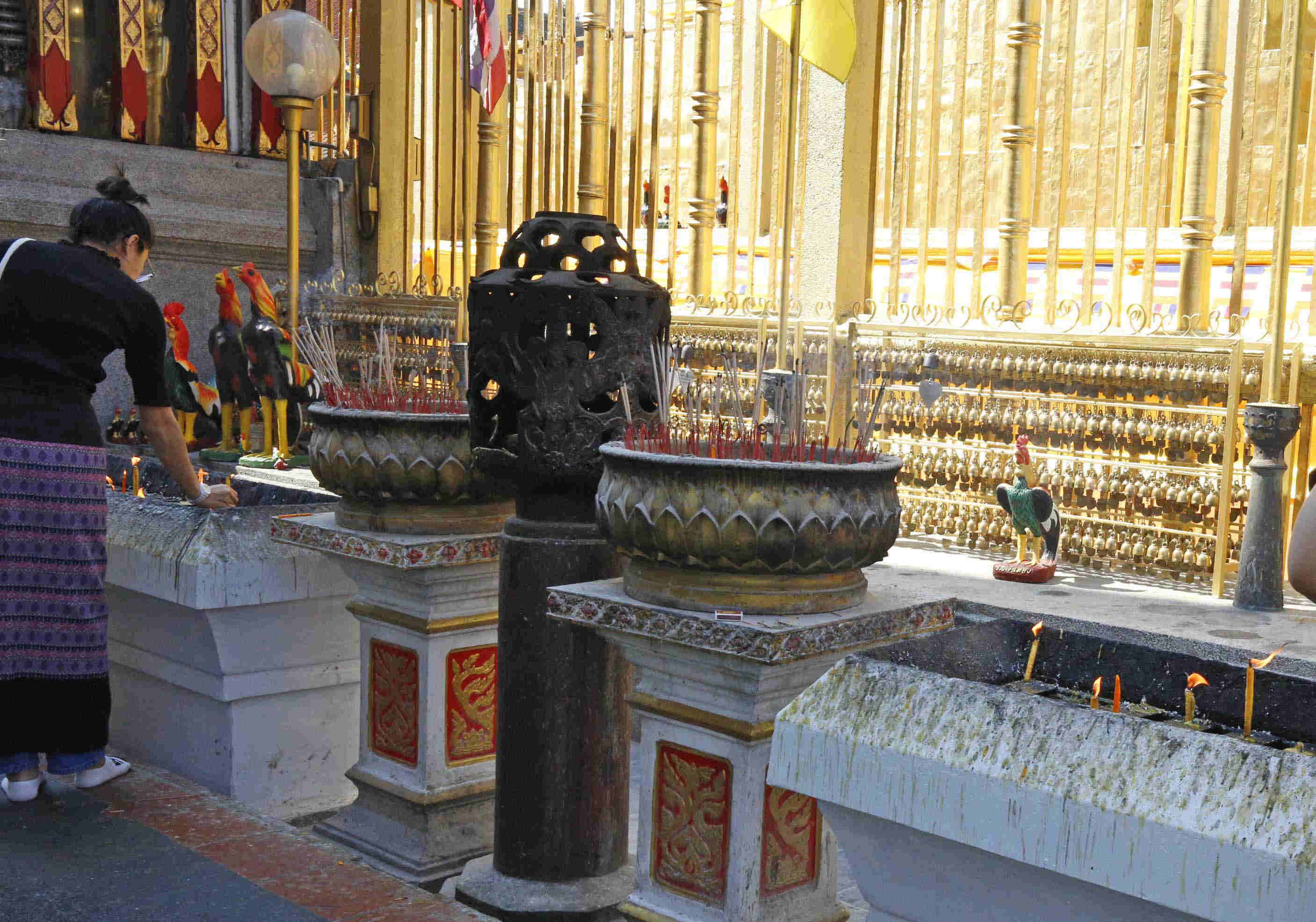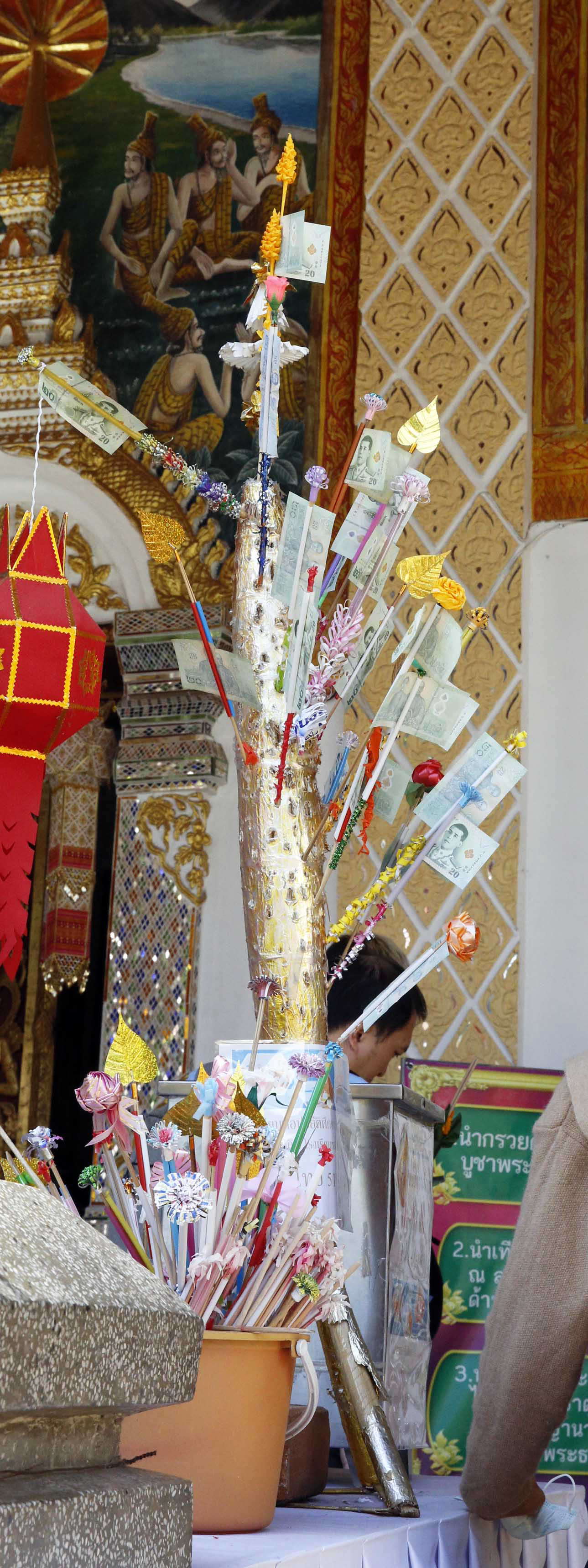 ご覧のように、お坊さんは、戒律により裸足で毎朝托鉢に出て食事の提供を受けます。これも戒律で自ら料理をしてはいけないためです。そして提供した方がお坊さんに向かって感謝の合掌をしています。お坊さんへの尊敬の念もあるでしょうが、この托鉢への食事提供で、自分の来世への「徳」、「善行」を積むこと(タンブン、と言う)ができたことへの御礼のためでもあります。お坊さんはお経をこの後すぐその場で唱えてあげていました。このタンブンのため、他に、お寺にお参りして仏に祈ること(拝礼は3回。仏法僧にそれぞれ1回行うため)、寄付をすること、その一つの形として金箔を仏像などに貼ること、生き物を逃がしてやること、弱者や困っている人を助けることなどがあります。また、自ら短期間でも男性が仏門に入ることなども大きなタンブンとなります。そして、タンブンは家族などに「分ける」ことができるとされ、男性が仏門に入ることは、仏門に入れない女性の家族(お母さんなど)のためにもなります。