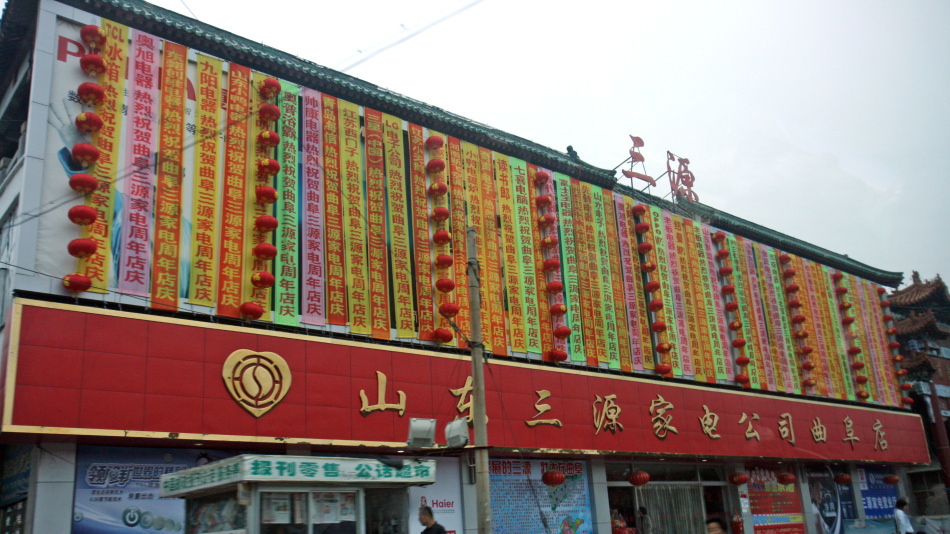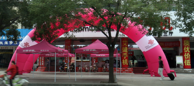 店の前のビニールアーチは特に携帯電話の店に見られた。競争が激しいのであろう。