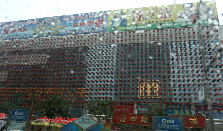 「宮灯」という赤いちょうちんをデザインしたものをたくさん並べたもの。雨の中車内から撮ったもので画像が汚いが。