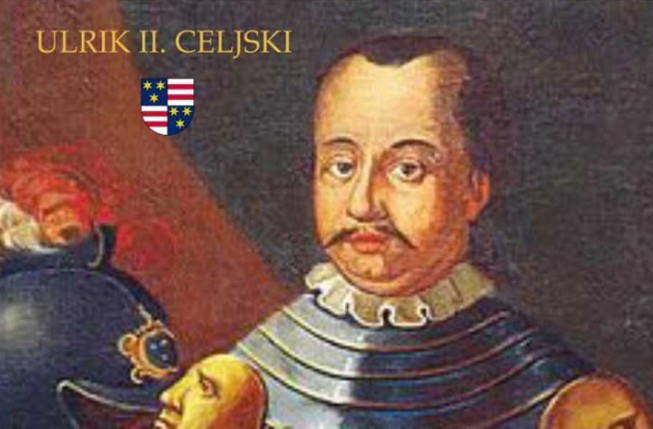 ツェリェ伯の六芒星の紋章(ツートンカラーに見えるのは日陰のため)とツェリェ伯ウルリヒ2世(1406-56)。右地図の●がツェリェ。