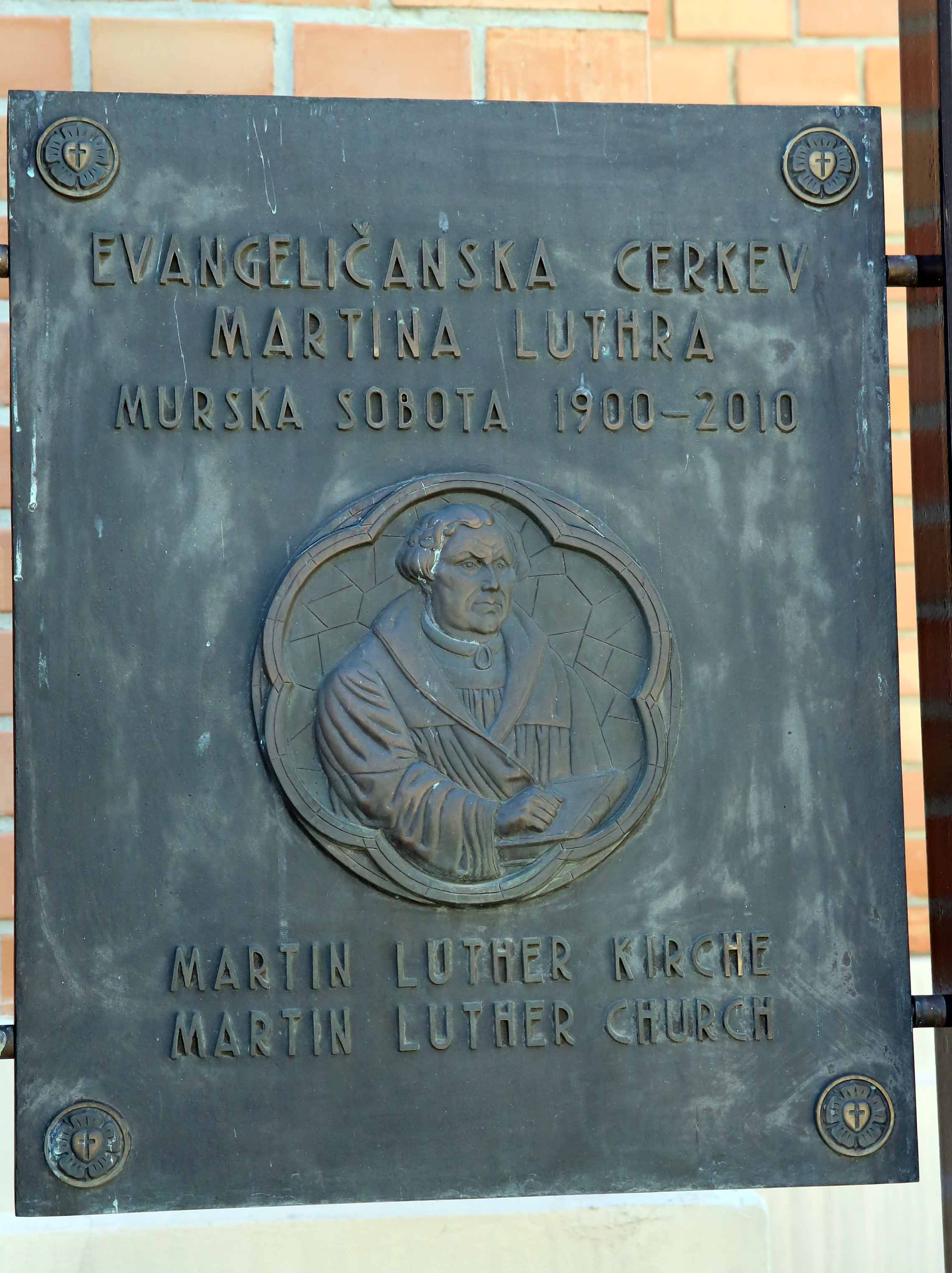ムルスカソボタのルター派教会。入口のルターの肖像のパネルやルターのステンドグラスを掲げている