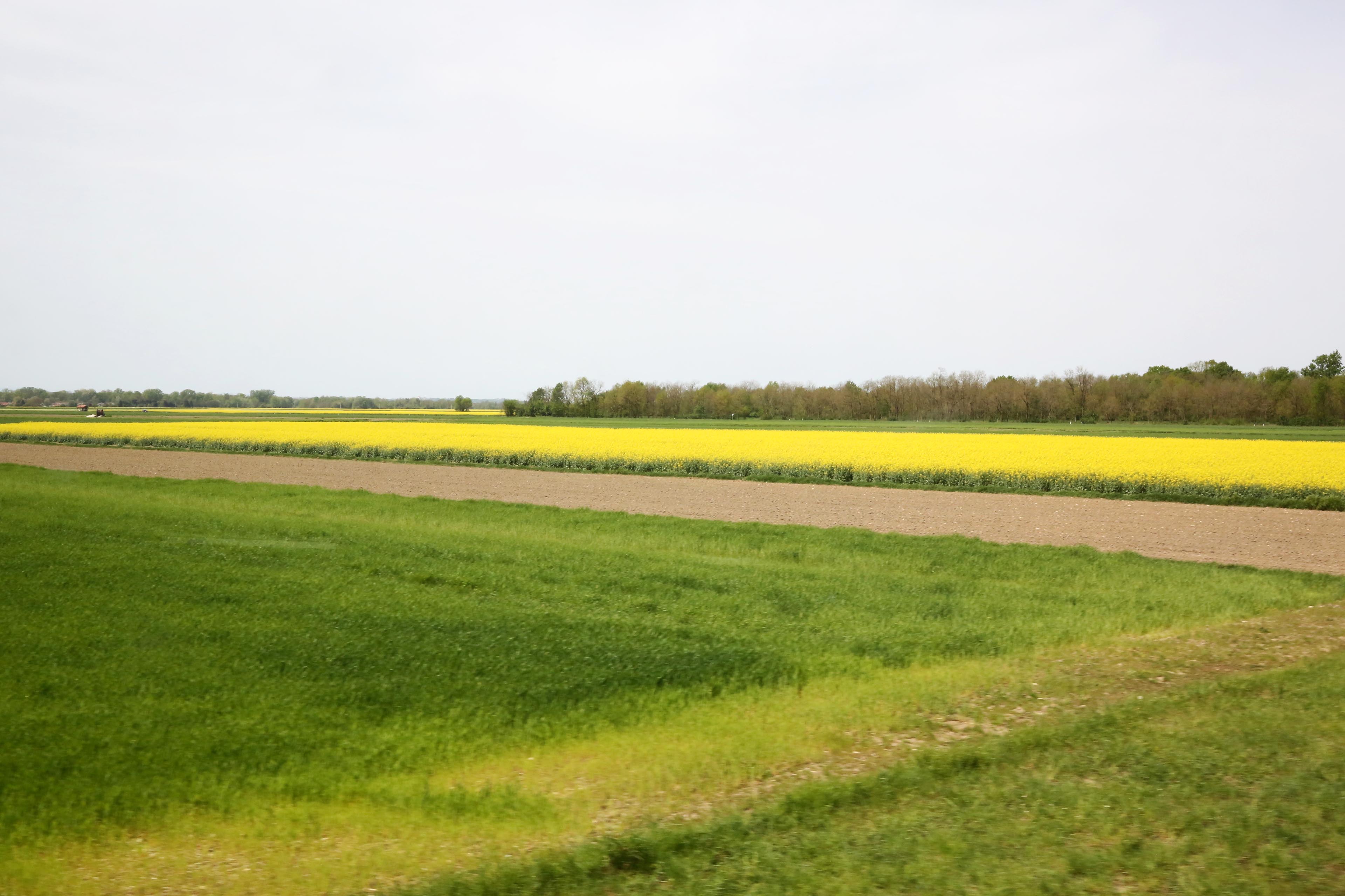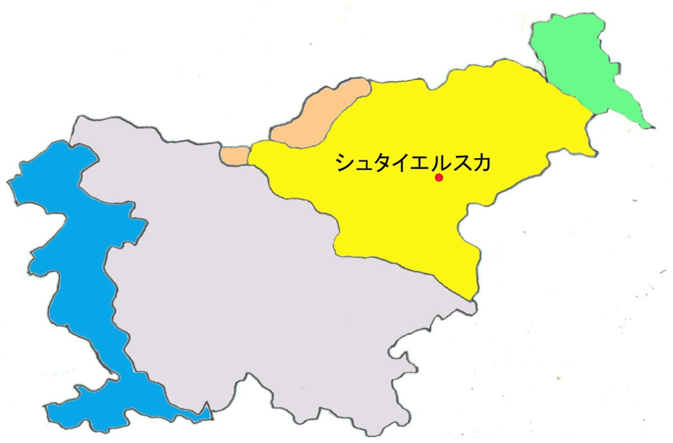 ここからが私の全くの独断であるが、国章の川は特定の川を指さないとされているが、ムール川(Mura)とメジャ川(Meža)の二つをまとめて指すと捉えるのである。「ムール川の向こう」という意味のプレクムリェ地方(下の地図中の緑色部分)は、ハンガリー領だったが、第一次大戦後、スロヴェニアも加わった「セルビア人、クロアチア人、スロヴェニア人の王国」領となった所である。地図中の黄色と緑の領域の間にムール川が流れている。私には失礼ながらスロヴェニアの国土が右向きの鶏のように見えるが、その場合の鶏冠または頭の部分である。その入口にあたり、かつこの地方の中心地でもあるムルスカソボタ市の周辺は、ハンガリー平原から続くかと思われるなだらかな耕地が広がっていた。4月末は、野菜のものか、油を取るためのものか、黄色い菜の花畑のようなものが多く見られた。