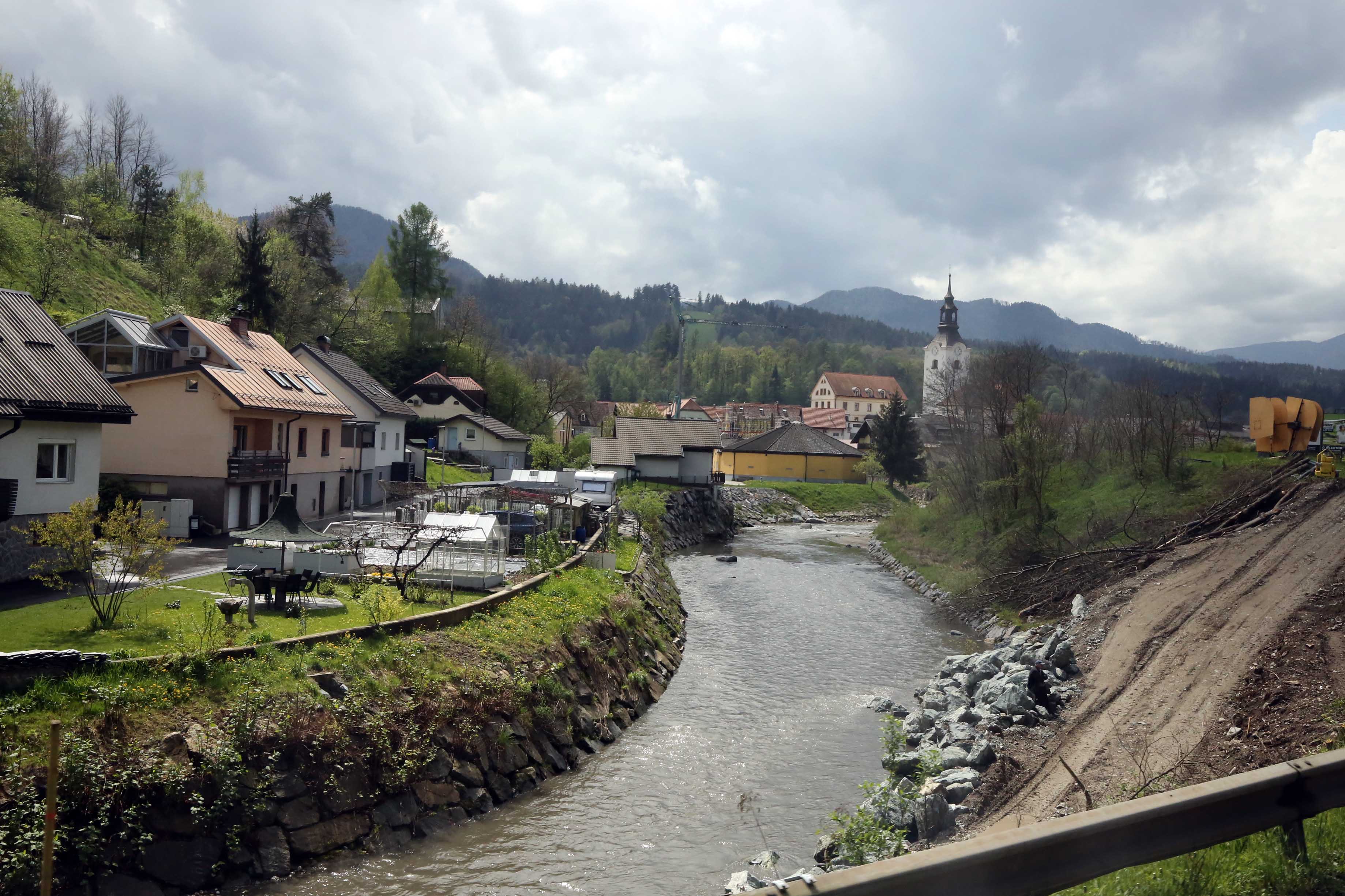 メジャ川とラブネ・ナ・コロシュケムの町。地図中の●がドラボグラード、●がラブネ・ナ・コロシュケム。メジャ川も大きな川ではない。