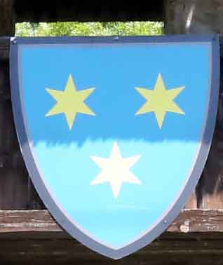 次いで、国旗の中にもある国章で目立つのが、三つの黄色の六芒星(ろくぼうせい)であるが、これは現在のシュタイエルスカ地方(下の地図中の黄色部分)から興り、15世紀の盛期には現在のスロベニアの国土面積以上に領土を広げたツェリェ伯国の紋章に由来する。ツェリェ伯はスロベニア人ではなく、ドイツ系の貴族であった。1308年に、後の神聖ローマ帝国皇帝の地位を独占したハプスブルク家の家臣となり、勢力を広げたのだったが、1456年、対立したハンガリー貴族により当主が暗殺され男系が途絶えたため、その領土がハプスブルク家に引き継がれ、シュタイエルスカはその直轄地となった。なお、ツェリェ伯やその領土についての詳しい説明は「Wikipedia: Counts of Celje」を参照のこと。