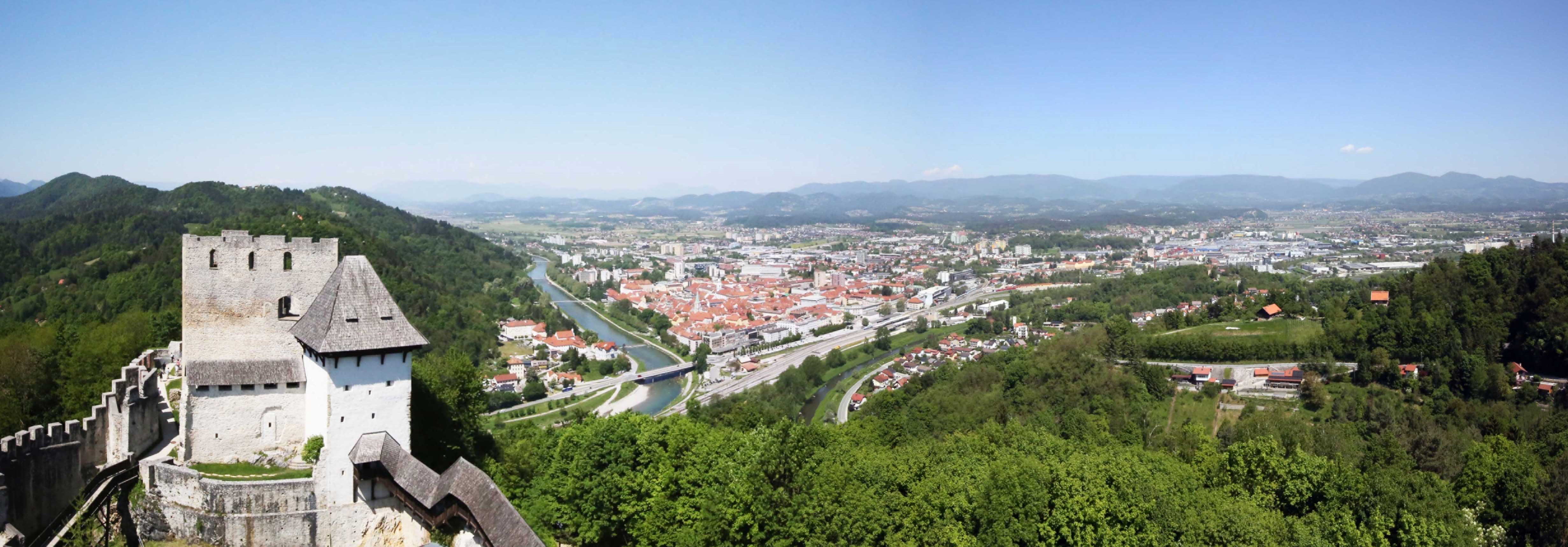 ツェリェ伯の拠点の一つ、ツェリェ城跡とシュタイエルスカの風景(ツェリェ市)。山の上までは、駅からタクシーが5ユーロで行ってくれ、ツェリェ城の入口のすぐ近くで降ろしてくれる(2025年5月の情報)。帰りもタクシーで降りるなら呼び出しの電話番号を降りるときもらうこと。