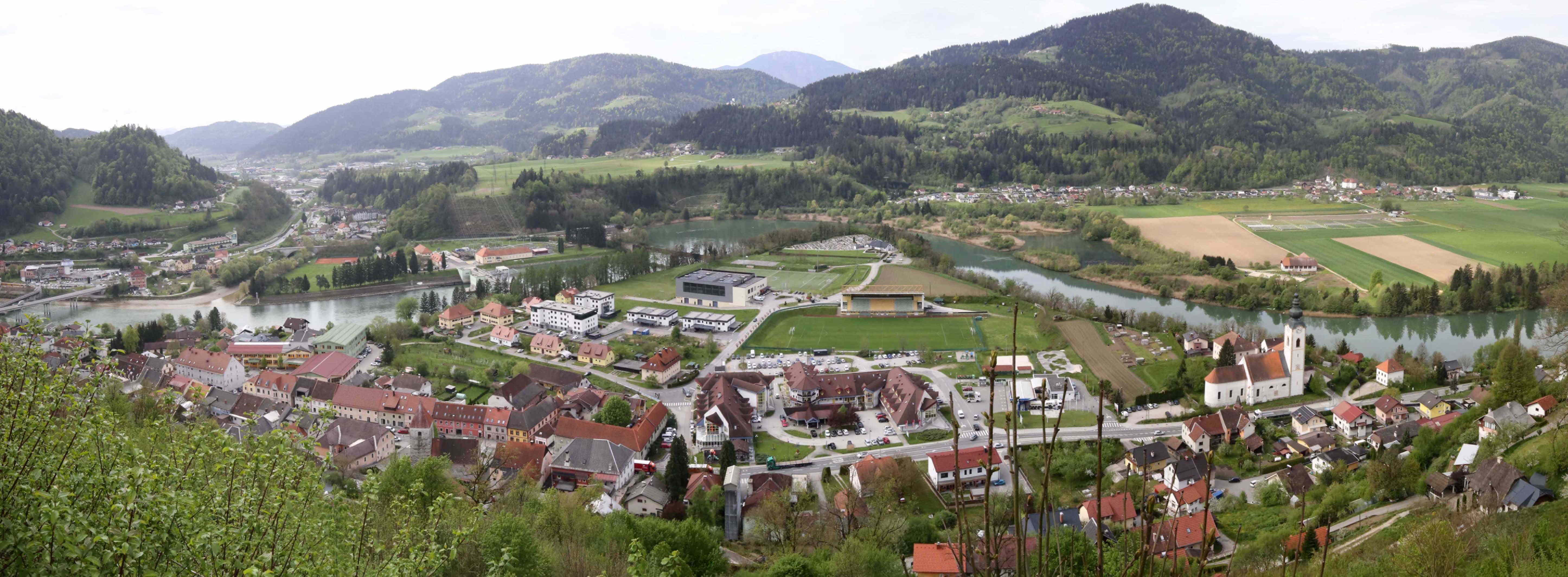ドラヴォグラード。ここに見られる川はメジャ川でなく、ドラヴァ川。バスセンターは左の橋を渡ったところ。ちょっと苦労して登った山の城跡から撮影したものを合成。