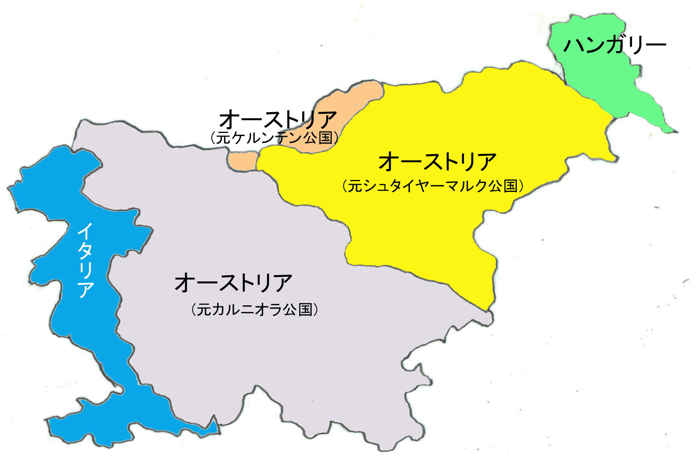 以上の事をまとめると、下の地図に示すように、現在の領土のスロヴェニアが、スラブ系民族による「セルビア人、クロアチア人、スロヴェニア人の王国」(第一次ユーゴスラビアに加わる前は、他の別々の民族の国家の支配下にあったことがわかる。このような状況の中で、「自分たちはスロヴェニア語を話し、書くスロヴェニア人だ。」という民族意識を高め、第一次大戦で戦い、ユーゴスラビア王国の一員となったり、その後新たに広くこの地の支配を行ったナチスドイツやイタリアとも第二次大戦で戦い、第二次ユーゴスラビア(ユーゴスラヴィア社会主義連邦共和国)に加わるも、そのユーゴスラビア連邦から最終的な独立を勝ち取った。このスロヴェニア民族の独立への歴史をこれから順に見ていこう。