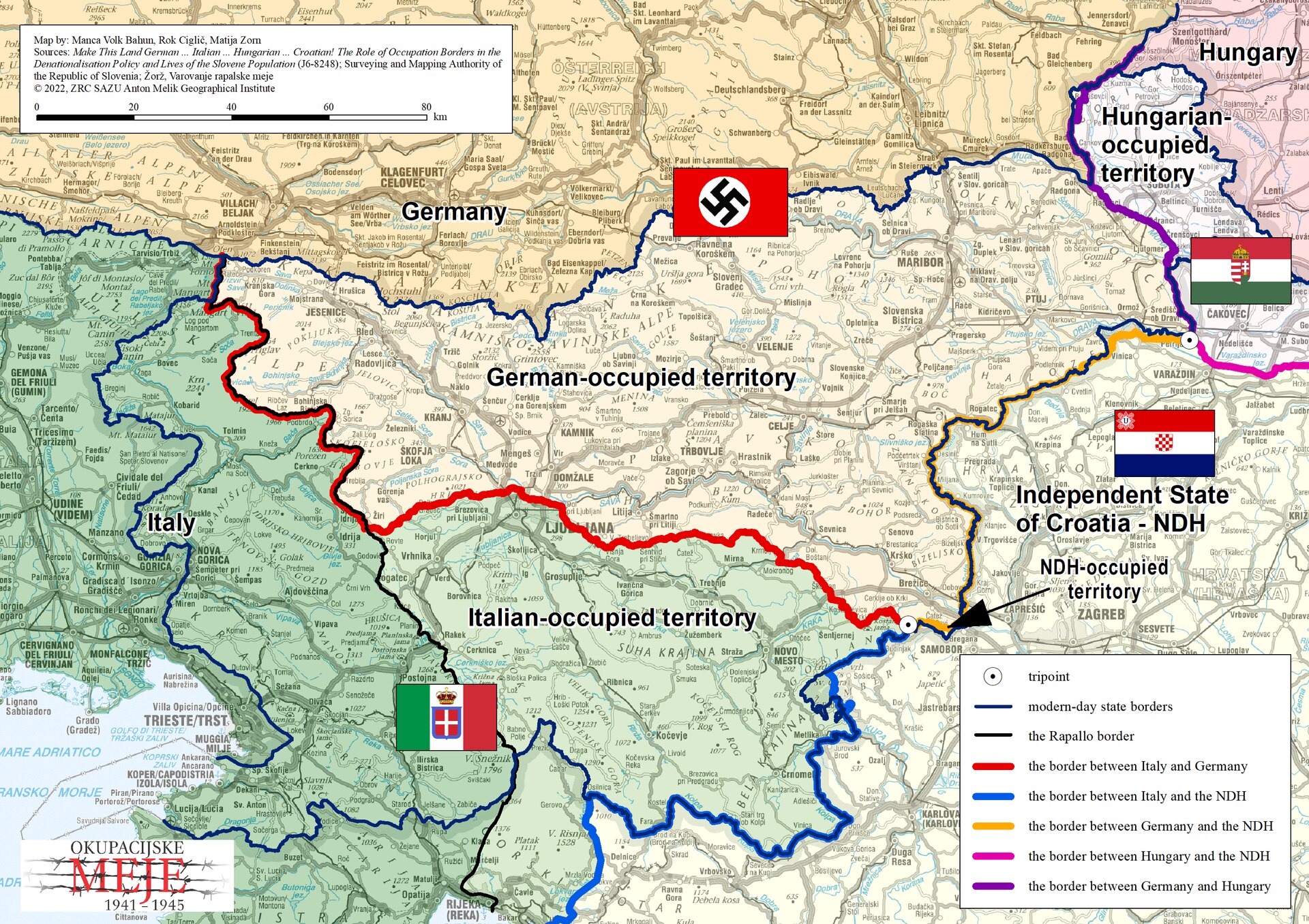 『スロベニアおよび周辺地域の占領区分(1941–1945年)』 © Manca Volk Bahun, Rok Ciglič, Matija Zorn / ARRS J6-8248 / 公開許可済(VRT #2023061010004342) / 教育目的使用