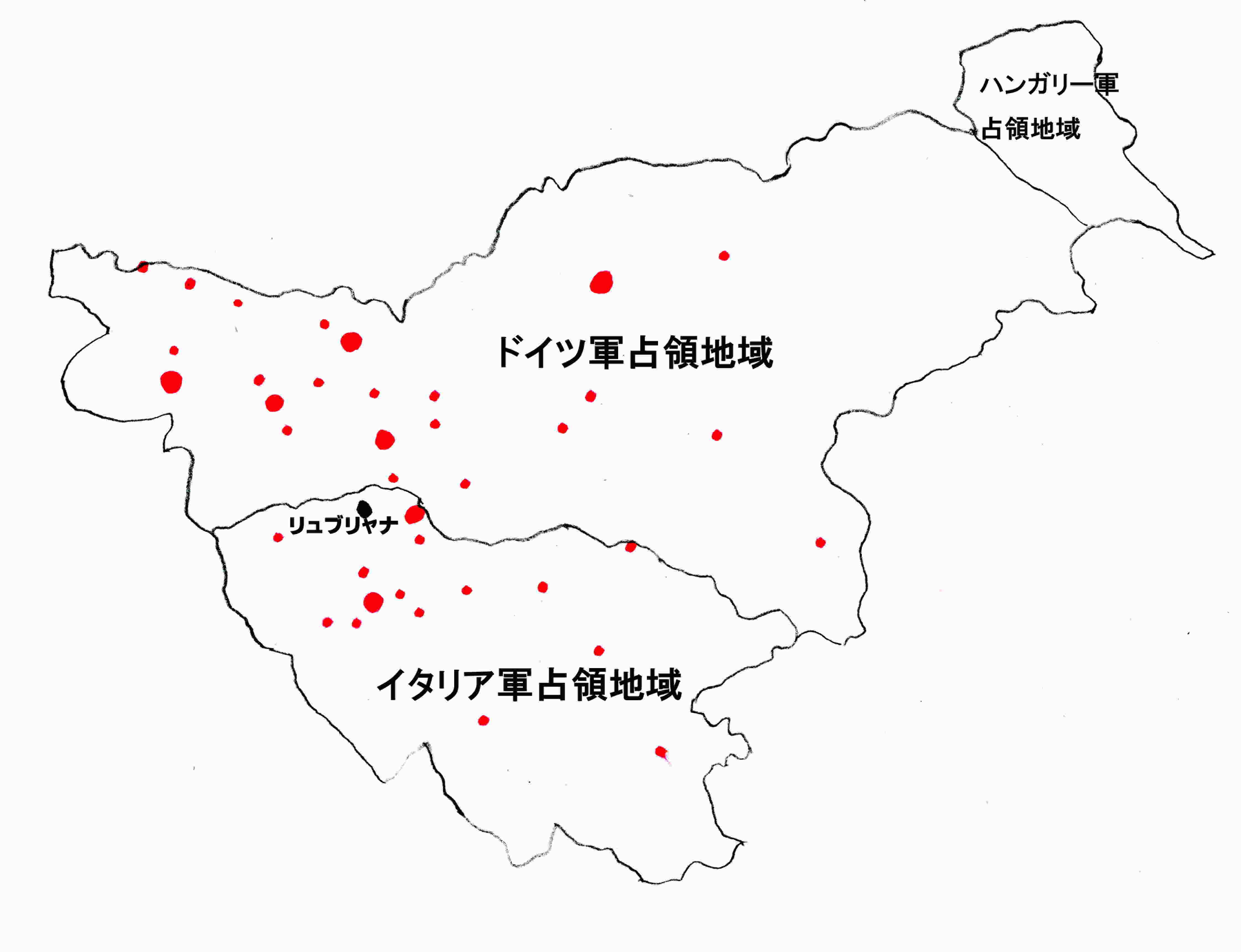 初期のパルチザンたちは、ほとんどが民間の服装や、さまざまな民間の制服を着ており、 ユーゴスラビア軍の制服の一部を身につけている者がわずかにいる程度だった。 しかし、すべてのパルチザンは帽子や帽子代わりのものに 赤い五角星とスロベニアの三色旗をつけていた。 これはパルチザン法の規定に従い、 スロベニアの国民解放パルチザン部隊に属していることを示す標章であった25。下に、出典25のp63の地図を基に、私が1941年のスロヴェニアのパルチザンの分布状況を示すため作った地図を下に掲げる。同書によれば、ハンガリー軍占領地域ではユーゴスラビア国王軍が組織的に撤退したため、置き去りにした武器が極めて少なく、パルチザン結成が遅れていたとのことである。
