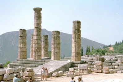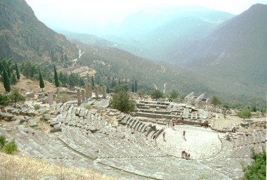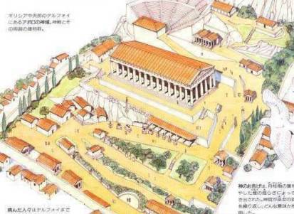 左はアポロ神殿跡。右はデルフィが山の中にあることを示す。劇場の左にアポロ神殿