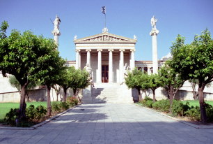 アテネ大学の隣のアカデミーにはソクラテスとプラトンの石像が並べられている。