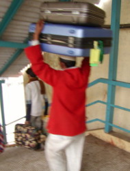 ゴラクプール駅の赤帽。私の青いスーツケースだけでも20kgはあるのに。