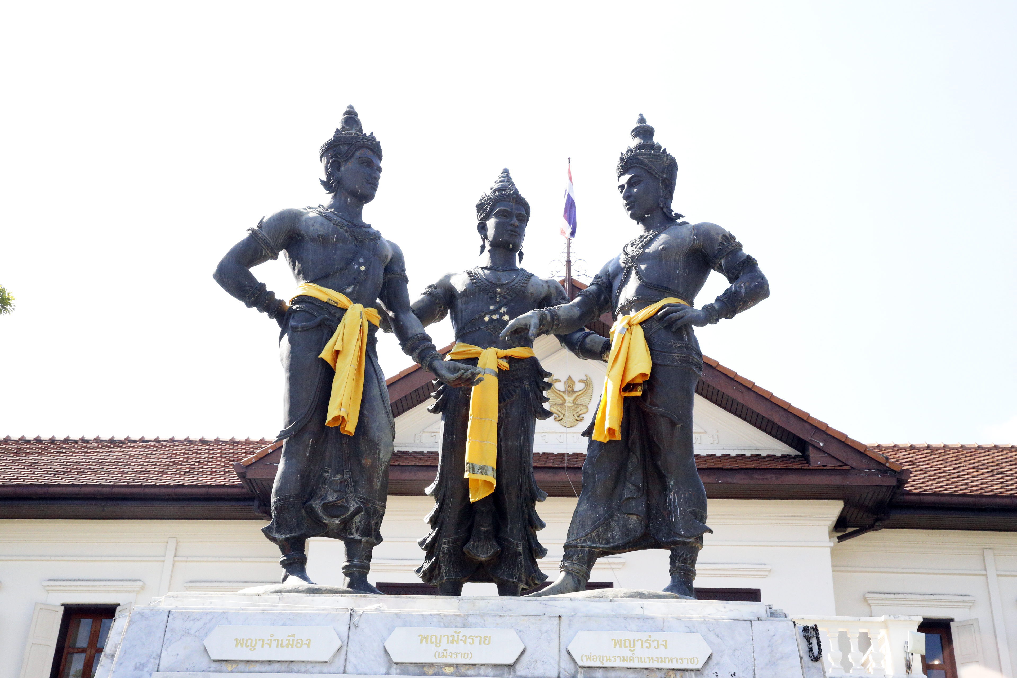 左は1300年頃の地図。右はチェンマイ市芸術文化センターの盟約を結んだ三王像。左からパヤオ王国(1098-1338)カムムアン王、ラーン・ナー王国マンラーイ王、ラームカムヘン大王。