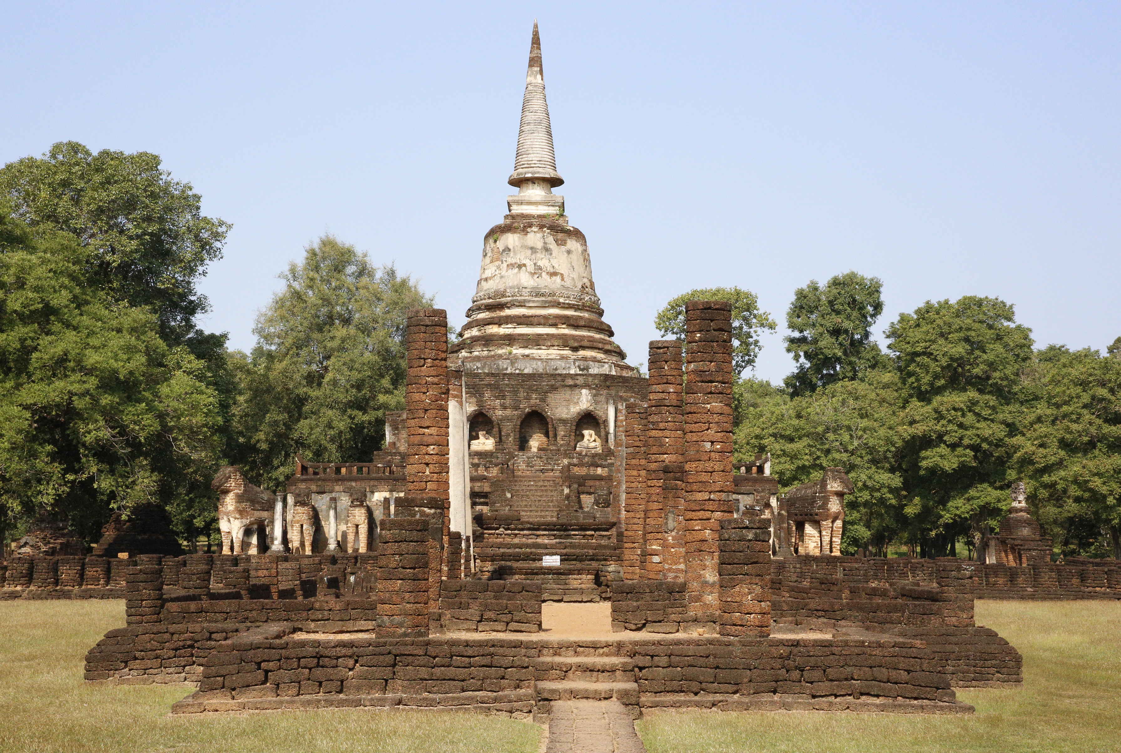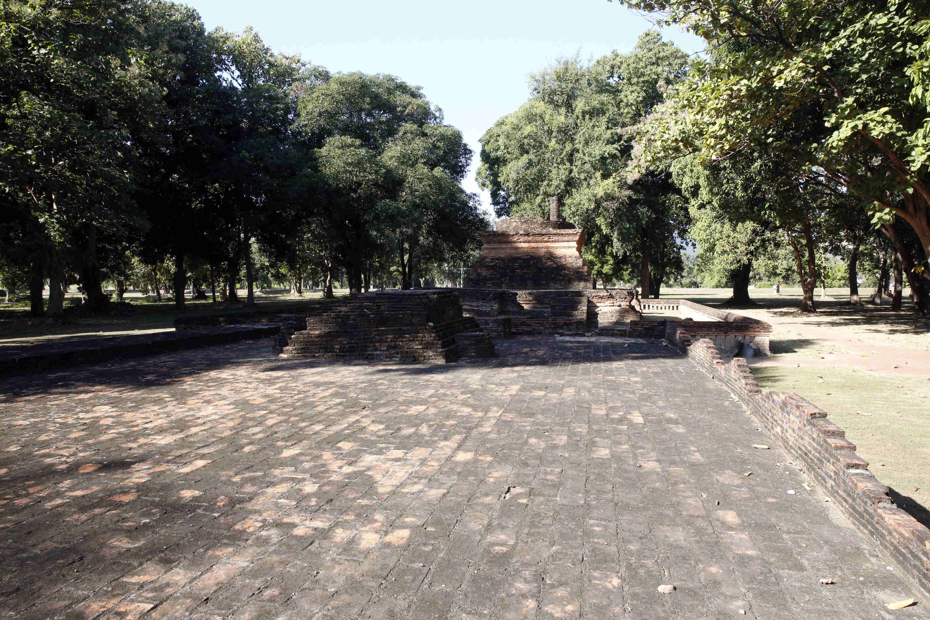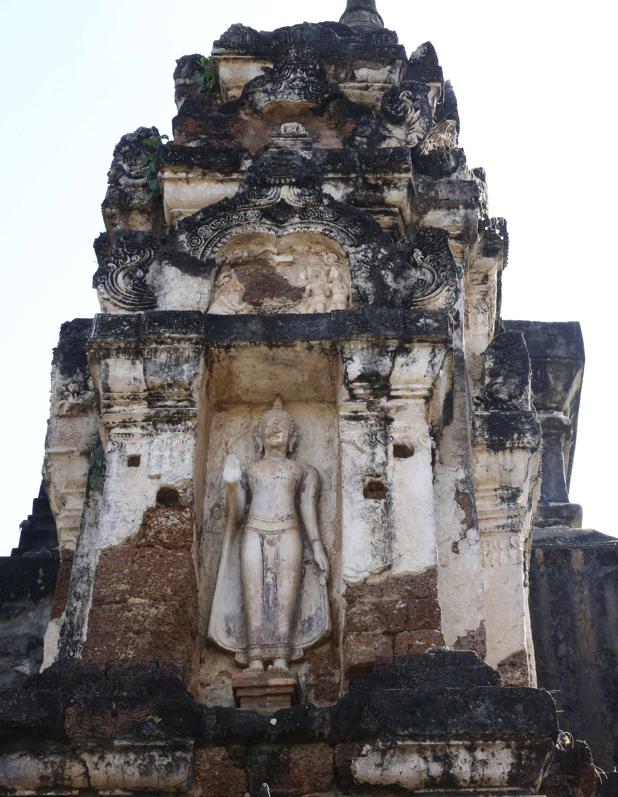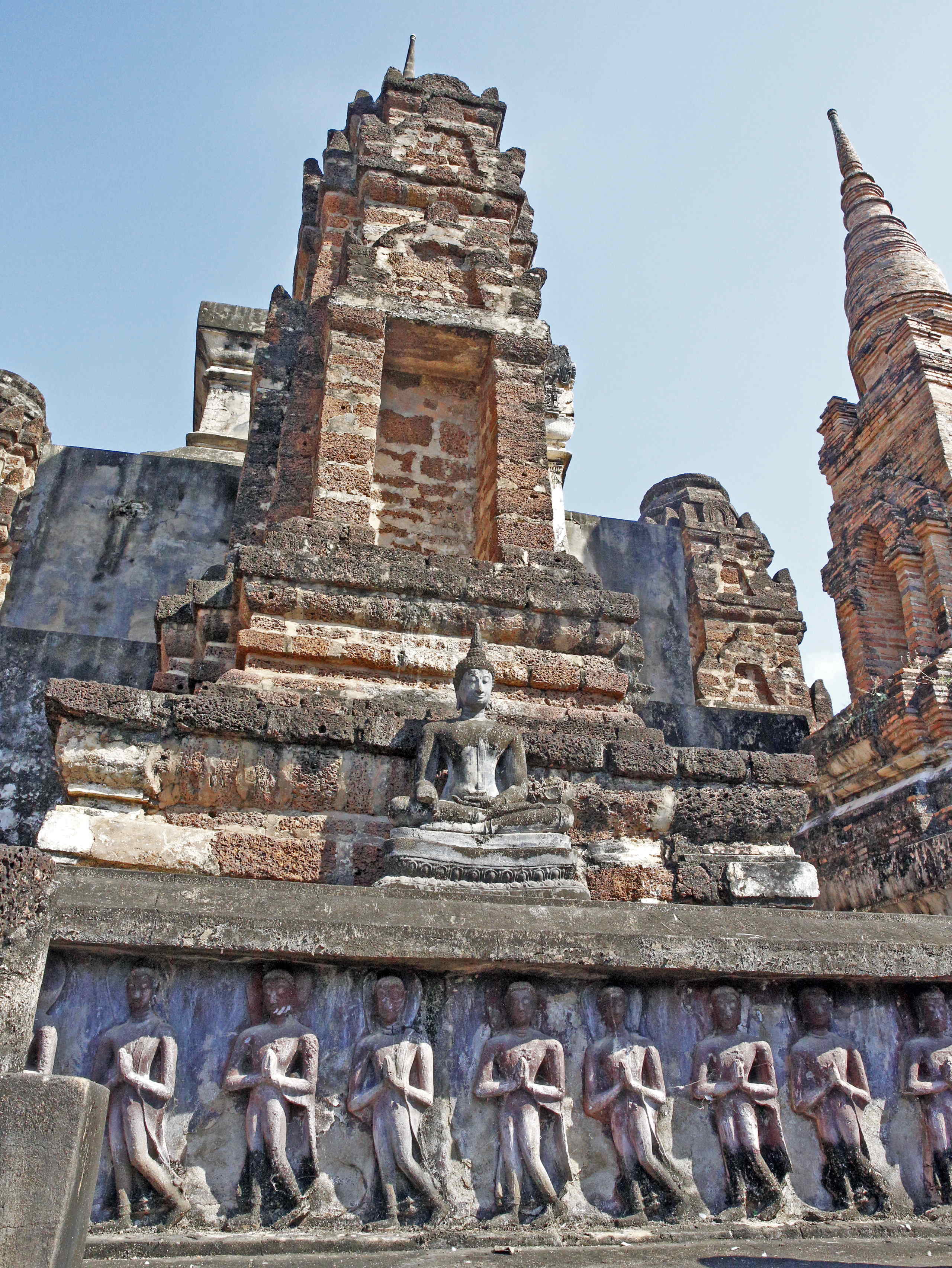 下段には仏立像が置かれていた。また、小塔の土台は、「『遊行するブッダの弟子たち』の漆喰の像で取り囲まれている。スコータイ仏教美術の最高傑作と言われている作品で、微笑を浮かべながら胸元で手を合わせて静やかに歩く仏僧の姿は爽やかで印象深い。」(『旅名人ブックス32 タイ/ラオス歴史紀行』p16)
