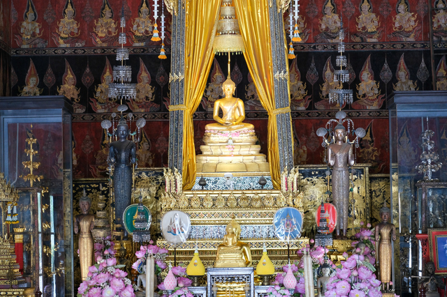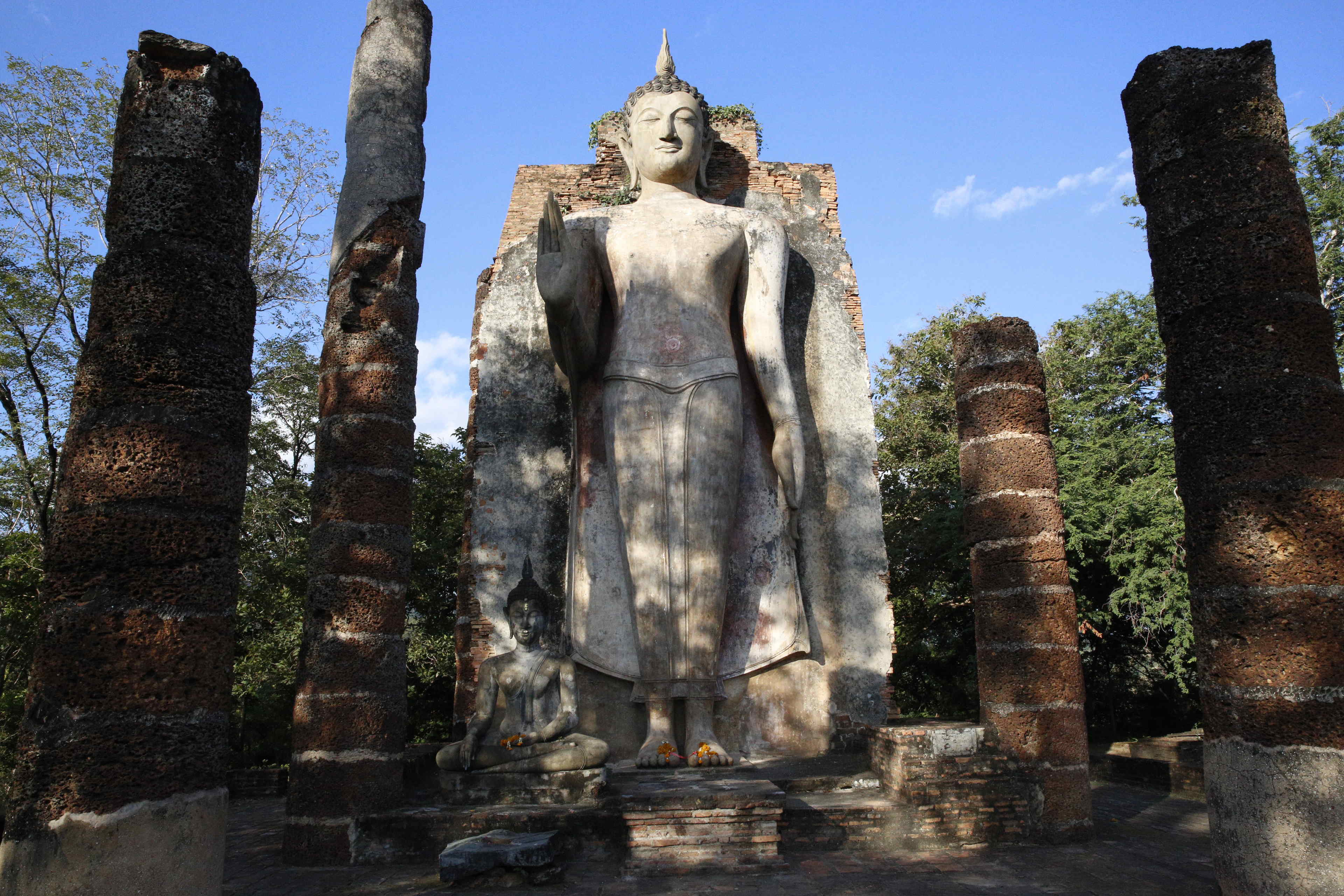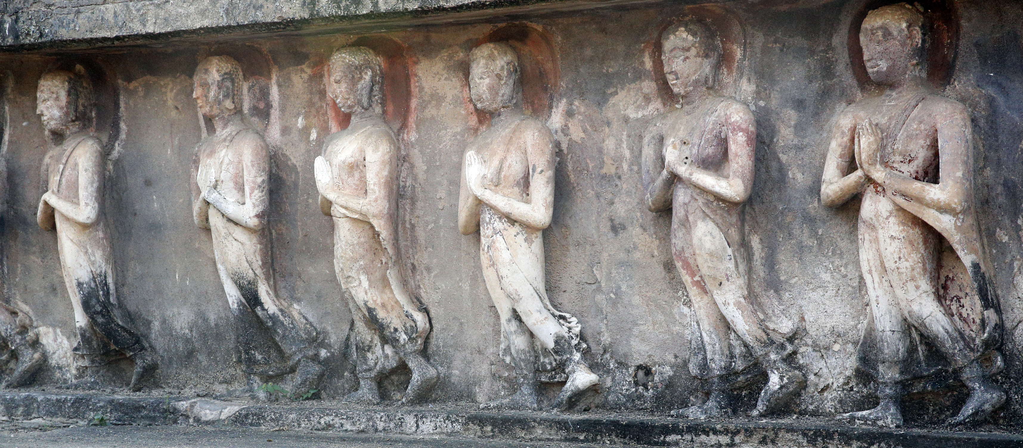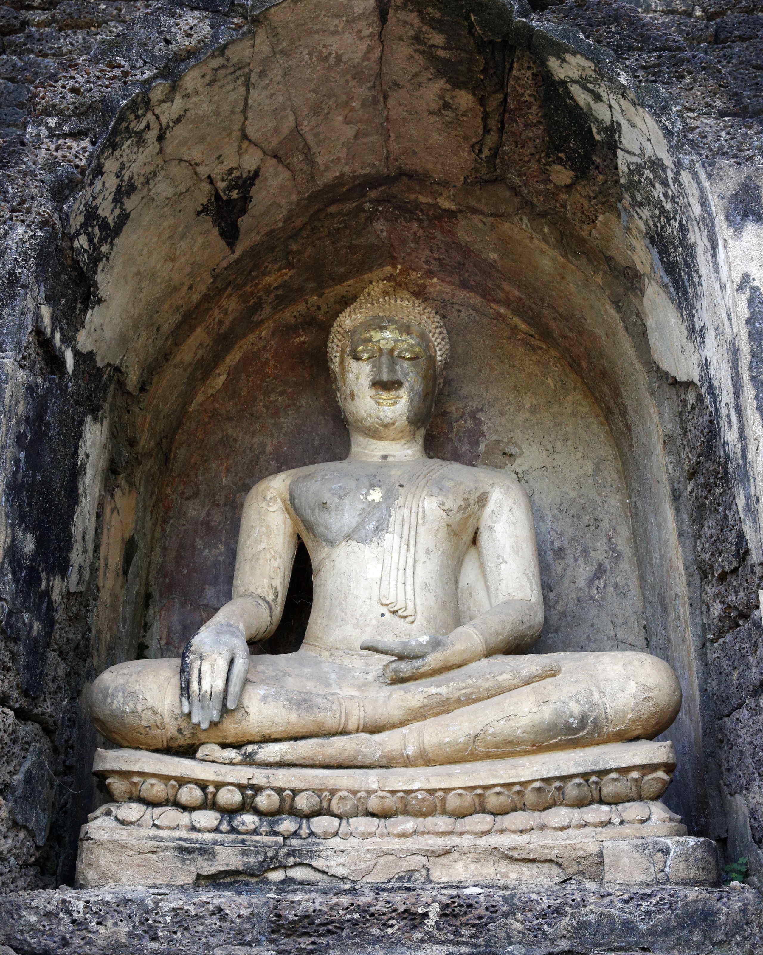 下段には仏立像が置かれていた。また、小塔の土台は、「『遊行するブッダの弟子たち』の漆喰の像で取り囲まれている。スコータイ仏教美術の最高傑作と言われている作品で、微笑を浮かべながら胸元で手を合わせて静やかに歩く仏僧の姿は爽やかで印象深い。」(『旅名人ブックス32 タイ/ラオス歴史紀行』p16)