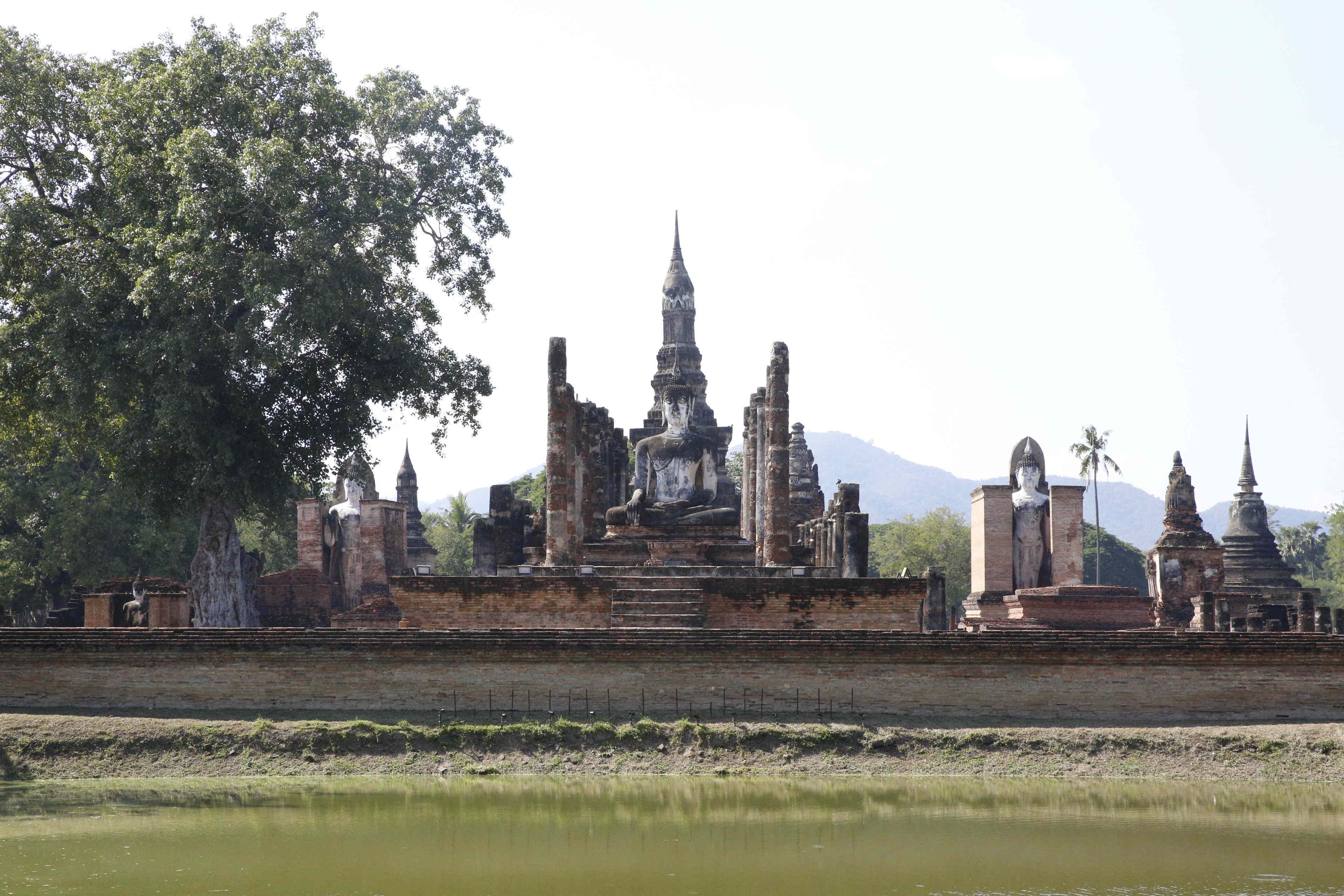 東側からのワット・マハータート。ちなみに一番手前の高い基壇に立つ建物の柱の跡と仏坐像はアユタヤ時代に増設されたものという。
