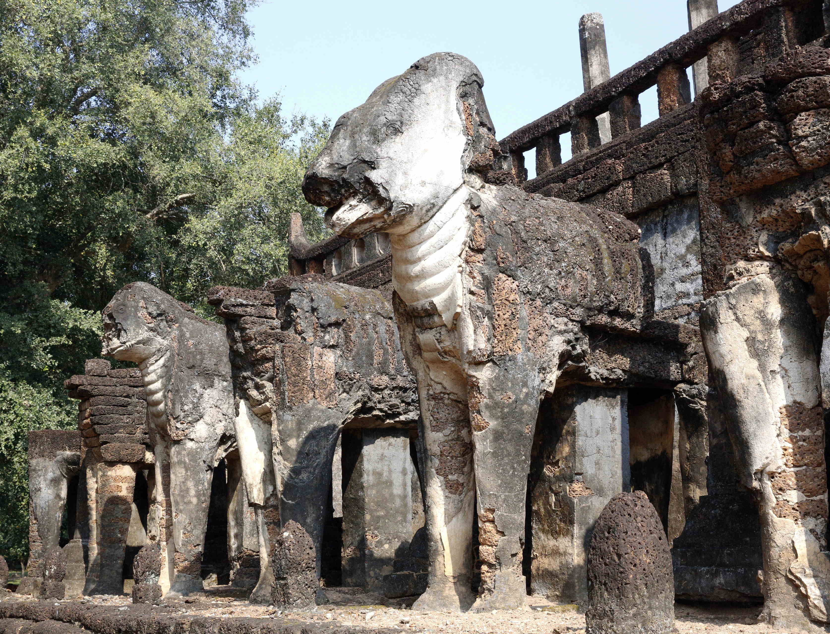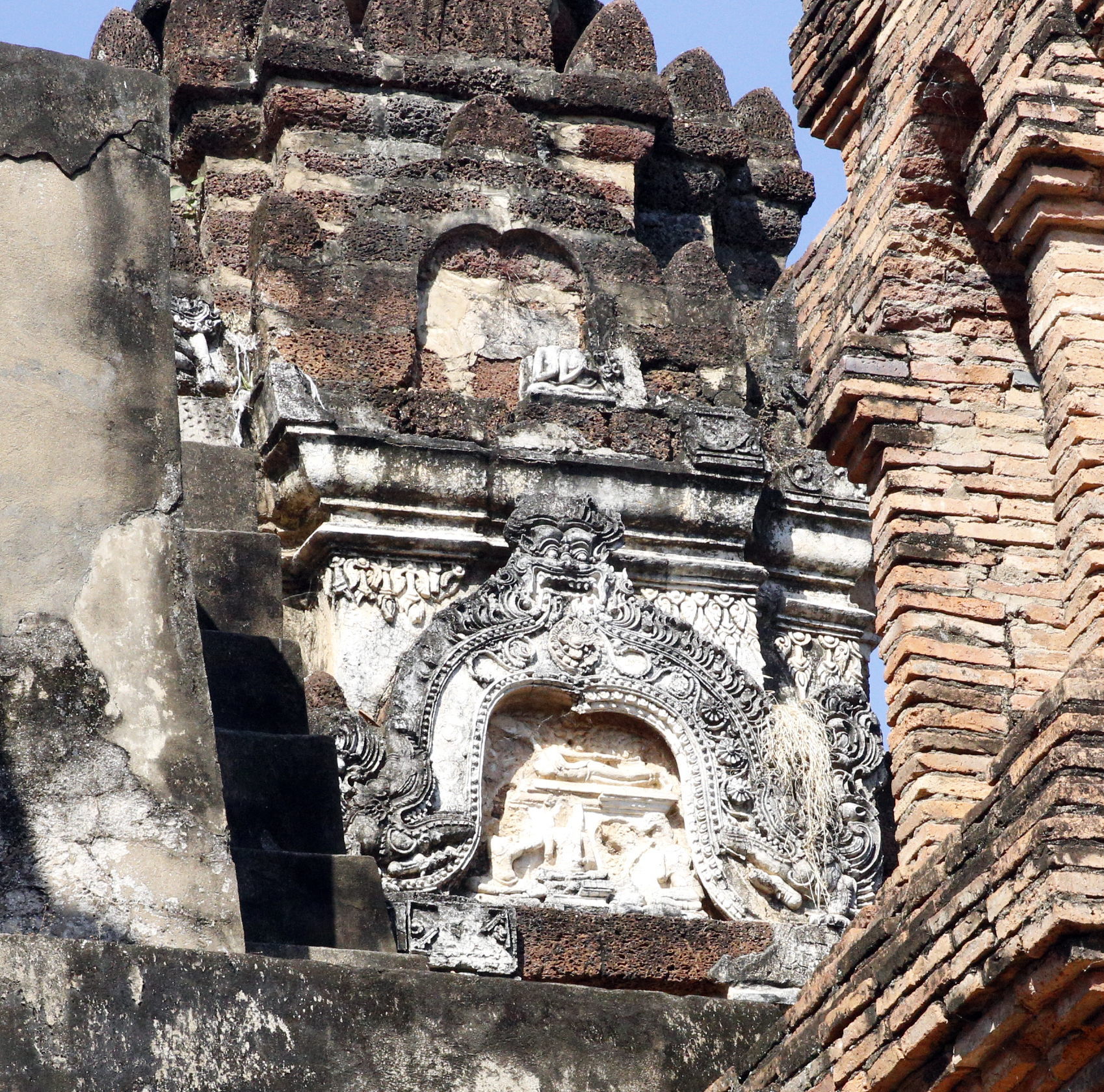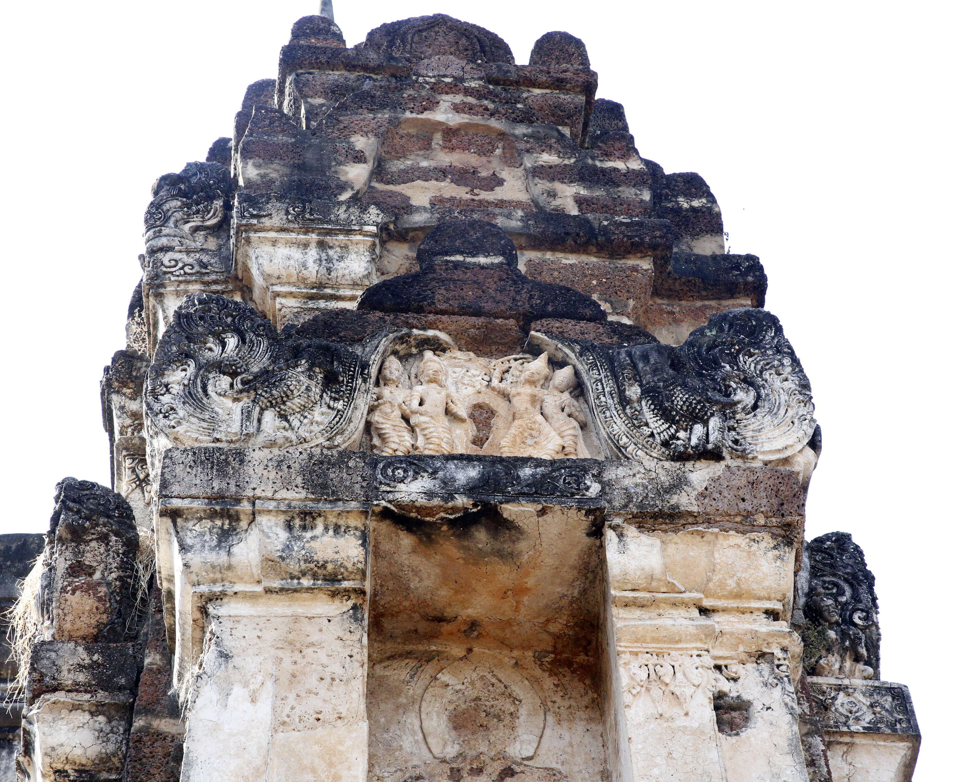 この東西南北の小塔にはそれぞれの三面に、上段に二段の模様を刻んだ破風(はふ。屋根の端に付く壁の部分)があり、今ではほとんど残っていないが、シャカの生涯などをレリーフにしたものが付けられていた。左はシャカが母の腋の下から生まれるシーン。腕を上げているのが母マーヤー夫人。右は破風の模様が残っている方のもの。よく見ると中央に鬼面があり、またその破風の形がスリランカの同時代のものと似ている、と伊東氏は説明されている(『夜明けのスコータイ遺跡』p74)。また、このレリーフはシャカ涅槃(ねはん。肉体的死)図。