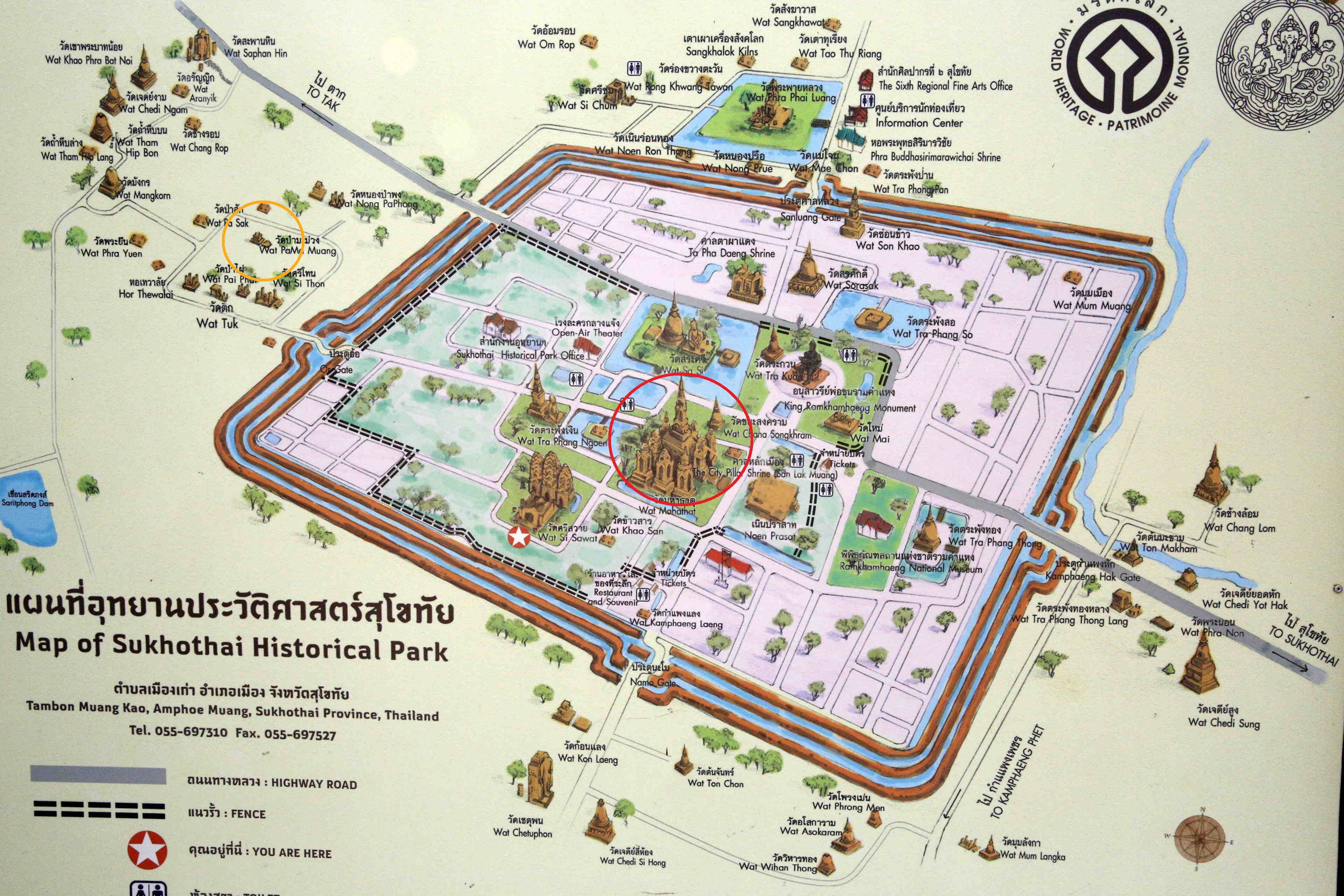ワット・マハー・タートのスコータイ都の中の位置は下の地図の中に赤○をつけてある。ほぼ中心に位置している。マハーは「大きな」、タートは「仏舎利」、だから「大仏舎利寺」の意味である。