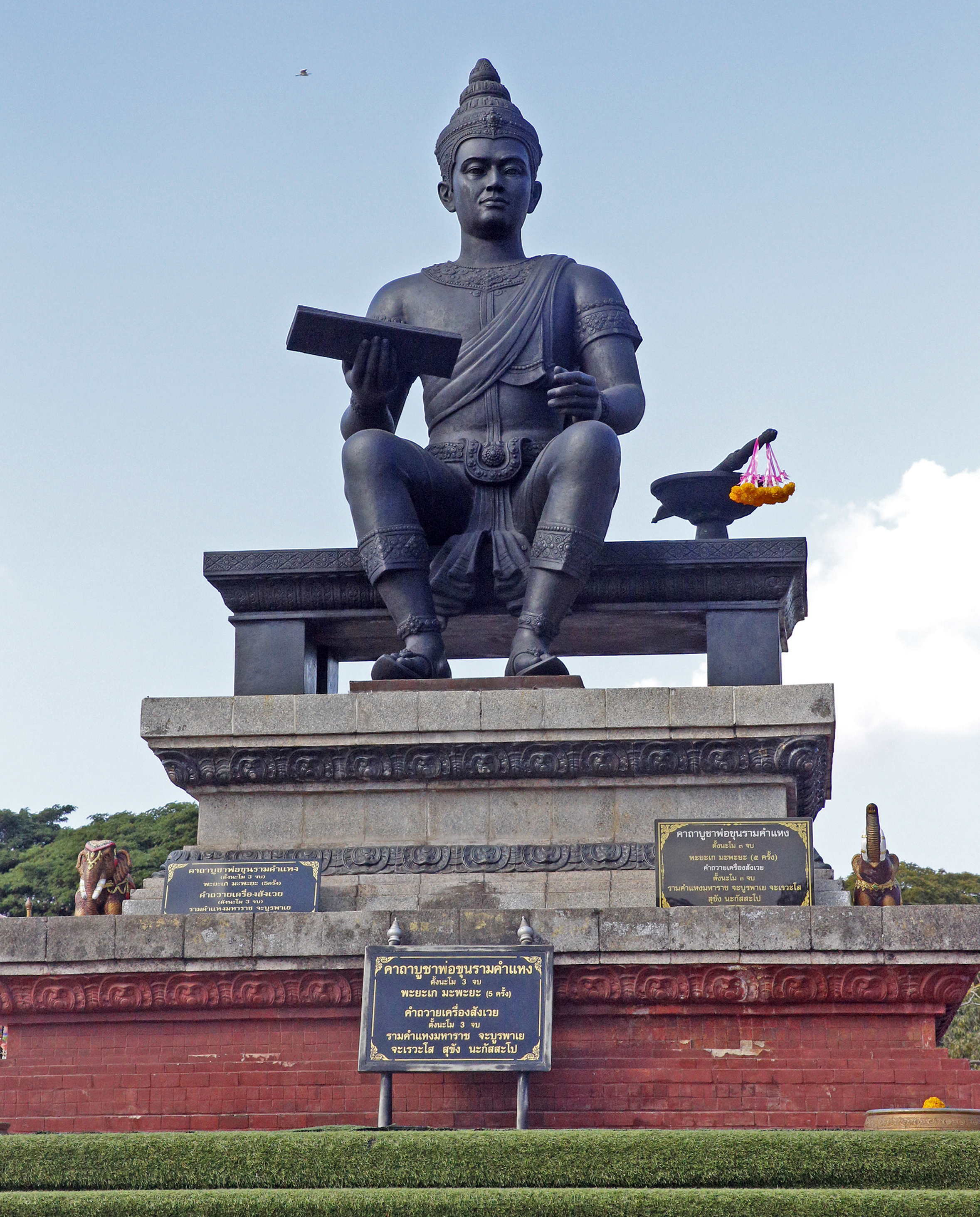 在位1279頃-1299年のラームカムヘン王とその業績については、1833年にスコータイ王宮跡の廃墟で発見された高さ1.1m、幅35cmの石柱「ラームカムヘン碑文」に記されており、これはバンコク国立博物館に展示されている。これによると、王の治世には下の地図で示すようにスコータイ王朝の勢力範囲が王朝史上最大となり、さらに北方のラーンナー王朝のマンラーイ王やパヤオ王国(タイ人の国家で1096年建国でスコータイより早いがそのとき独立していたかは不明?)のガムムアン王と同盟を結んで、南下しようとした元(げん)帝国に対する北方の安全を固めようとした。元は、日本の鎌倉時代に2回も攻め込んできた、中国を支配していたモンゴル人の強大な帝国であり、この地への侵攻も考えられた。また、王は1283年にクメール文字を元にしたタイ文字を考案したと考えられており、さらに積極的にスリランカ上座部仏教を受容し、タイ人のアイデンティティを確立しようとした。このため、現在でもタイでは「三大王」の1人として「大王」と呼ばれ尊敬されている。