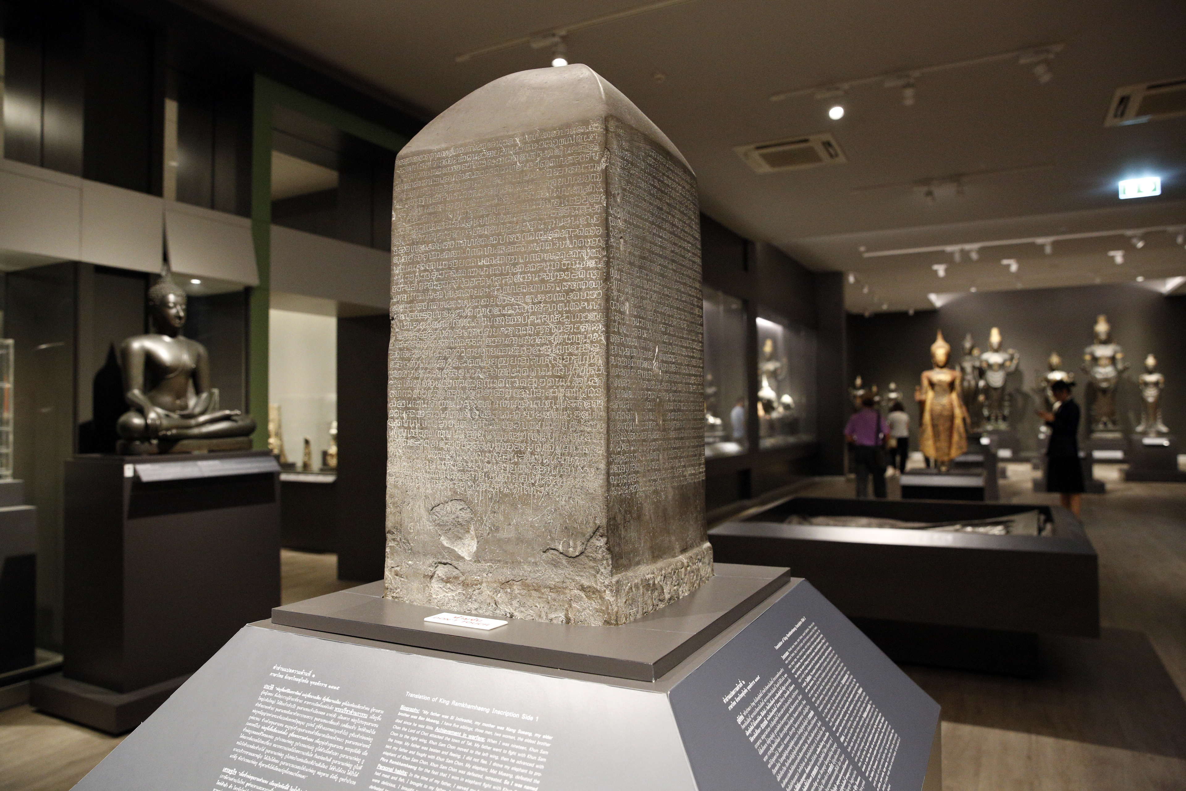 左はスコータイ歴史公園内のラームカムヘン像。右はバンコク国立博物館のラームカムヘン王碑。碑の高さは見てお分かりの通り。四面にびっしり刻まれている。この博物館も写真撮影は自由。