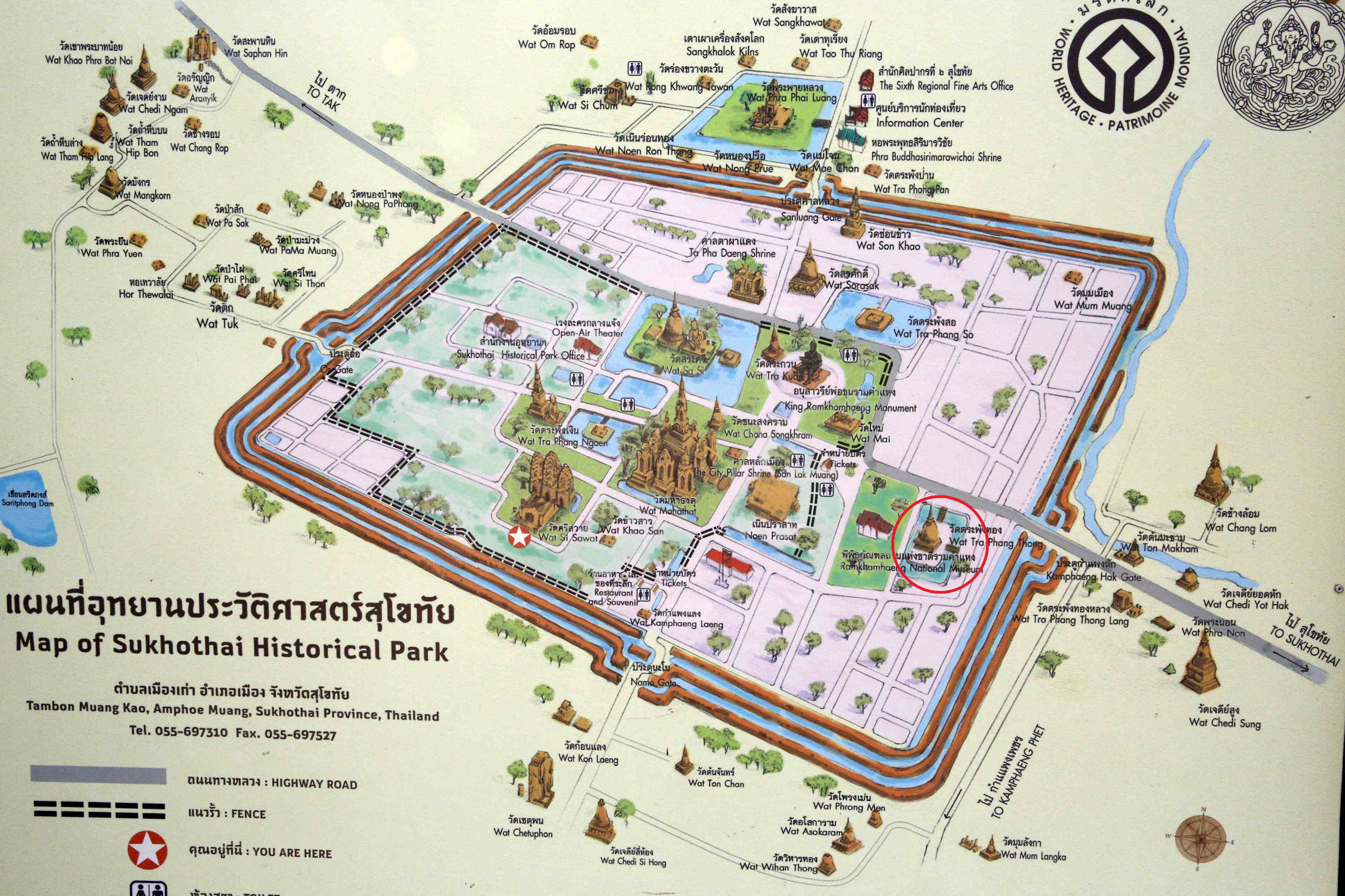 ワット・マハー・タートのもの以外で有名なのは、「銀の池の寺」という意味の、ワット・トラパン・ングンのものである。場所は下の赤○で囲ったところ。東側に大きな池があることからこの名がついた。