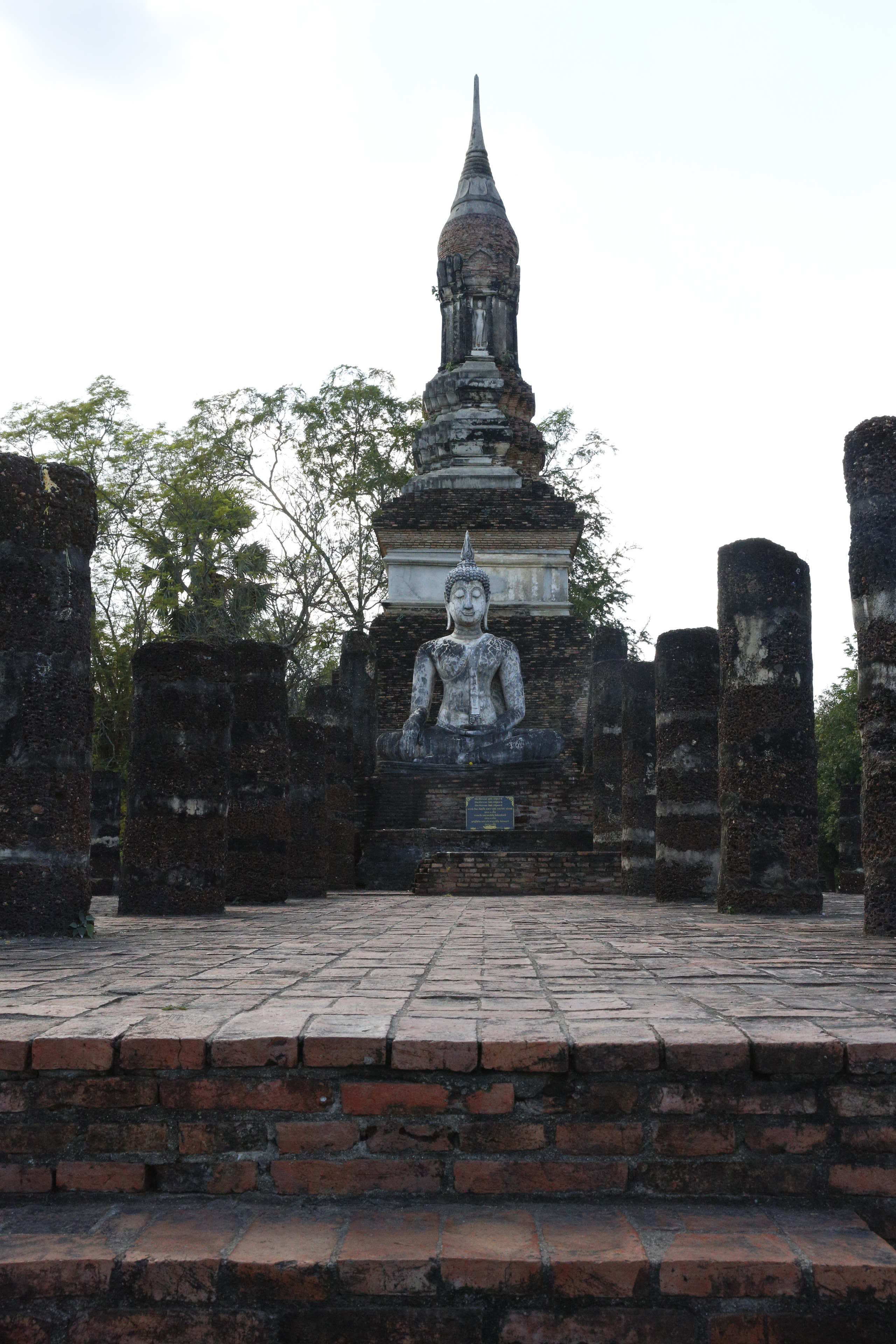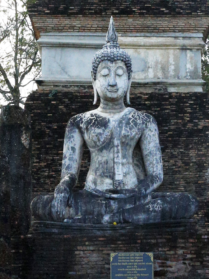 次に仏像であるが、上の塔のすぐ前の坐仏像を下にアップにしてみる。やや細面の顔かたち、伏し目がちなまた微笑しているような口元のやさしい表情、モン人の仏像のようには繋がってない眉毛、仏頭から炎のようにになって出る光、左肩から臍の近くまで垂れ下がり先が逆V字形切れ込みになっている細長い着けている布など、典型的なスコータイ仏像の特徴をもっている。伊東照司氏は、スリランカの仏像をもとにしつつ、スコータイで独自に進化したもの、と説明している。