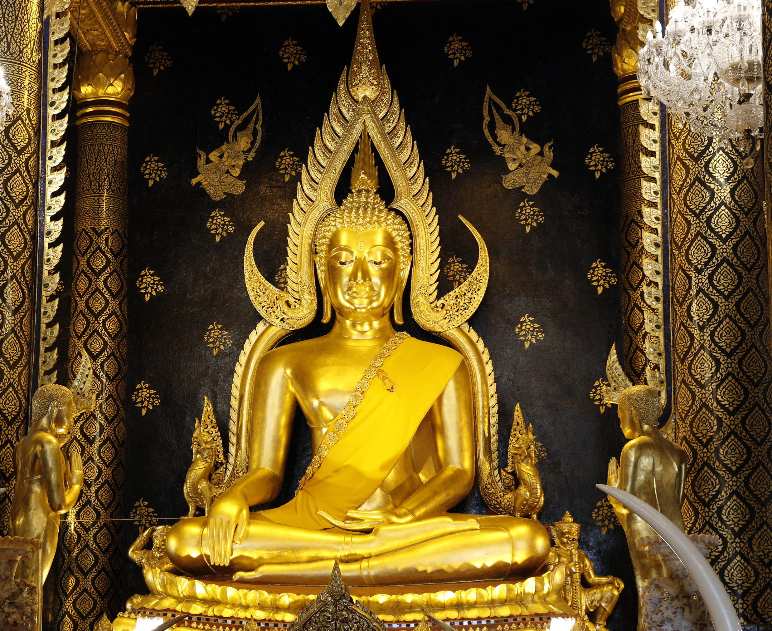 仏像の最後に、スコータイ9代目王マハーンマハータン4世(在位1419-38)の統治時代に鋳造され、17世紀初めのアユタヤ時代に金箔が貼られた「タイ国内で最も美しい」と言われる仏像を紹介しよう。「勝利の王(プラ・プットチナラート)」とも呼ばれる高さ3mのシャカ像である。スコータイ時代に王の直轄地として栄えたピッサヌロークのワット・プラ・シー・ラッタナ・マハートに安置されている。写真撮影は自由だが座って撮る方がいい。