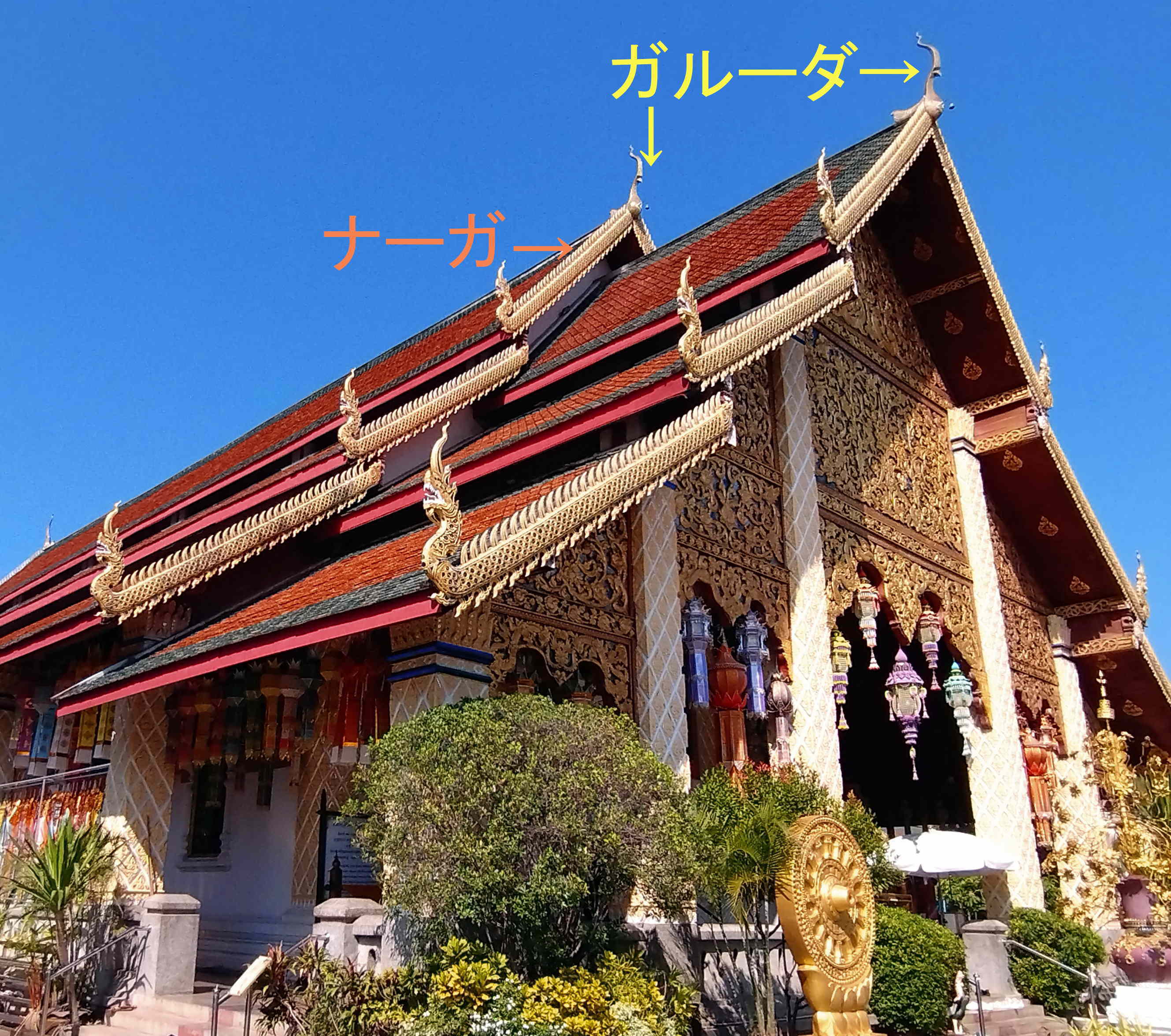 建物の各屋根の前面と後部の最上部に鳥の神ガルーダ、その脇から軒にかけて、蛇の神ナーガが必ずと言っていいほど置かれています。共にインドの神話に基づくもので、ガルーダは光輝く姿で生まれ、血を分けた兄弟である蛇のナーガと不老不死の薬をめぐって戦いになったということです。この戦いの中で、ガルーダはその乗り物となる条件で、ヒンドゥー教最高神の一つで慈愛と生類救済の神ヴィシュヌの助力を得ました。未だにガルーダが両手でナーガを持って押えている姿がこの屋根の形だという考えがあります。または、和解し、共に仏の守護をしているとも解釈されています。