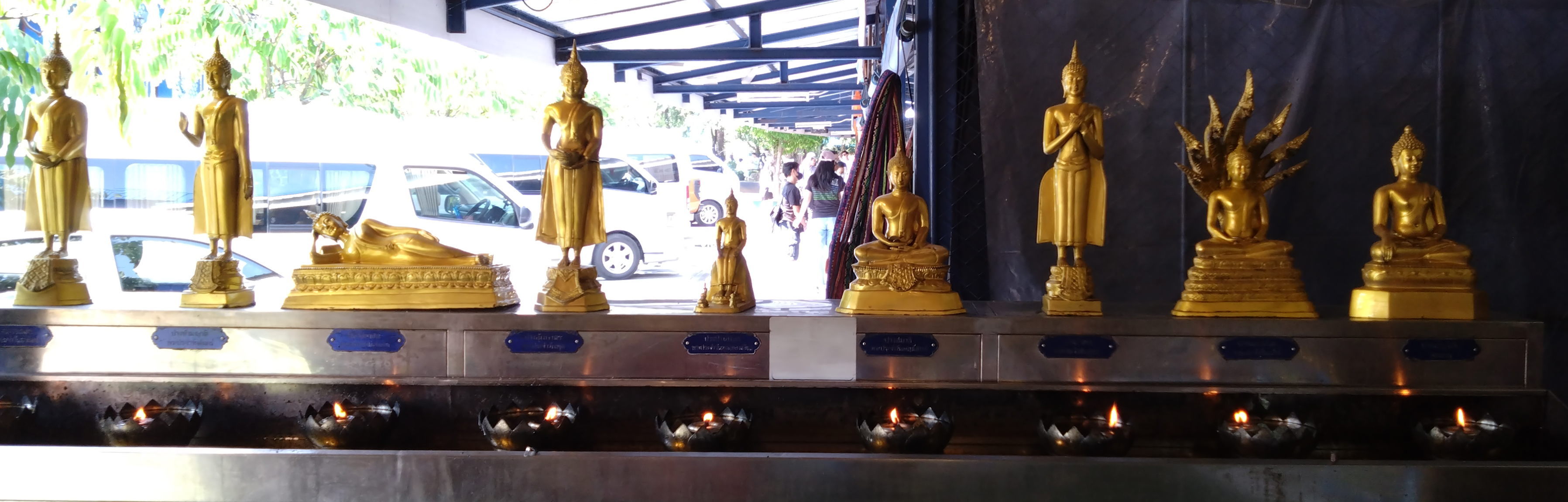 左から順に、一番左のは、日曜日(日曜午前6時から月曜午前5時59分まで。以下生まれた日の曜日は同じように決まる)生まれの人のための仏像で、シャカがブダガヤの菩提樹の木の下で瞑想している姿(大乗仏教の禅宗では坐禅して瞑想していた、としていますが)。次は月曜日生まれの人のための仏像で、争いを制止している姿とも、干害、飢餓を制止している姿とも言われます。次は火曜日生まれの人のための仏像で涅槃(ニルヴァーナ)の境地に達して悟りを開いた姿を意味し、入滅(逝去)したときの姿とも言われています。次は水曜日の昼(午前6時から午後5時59分まで)生まれの人のための仏像で、布施をしている姿。次は水曜日の夜(午後6時から木曜午前5時59分まで)生まれの人のための仏像で、ブッダが象と猿という動物に説法している姿。