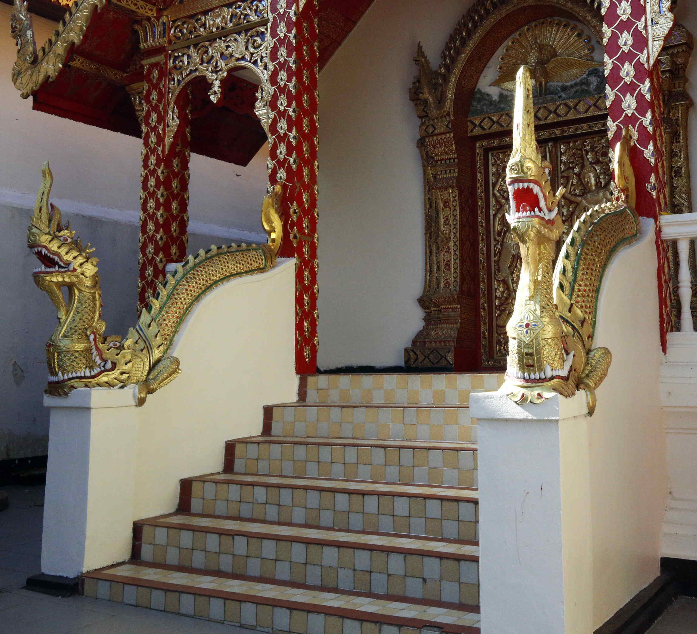 階段の手すりにも魔除け、として蛇神ナーガが飾られています。かつてのラーン・ナー王朝の勢力下の寺院では蛇ナーガが龍を飲み込んだ形が一般的です。