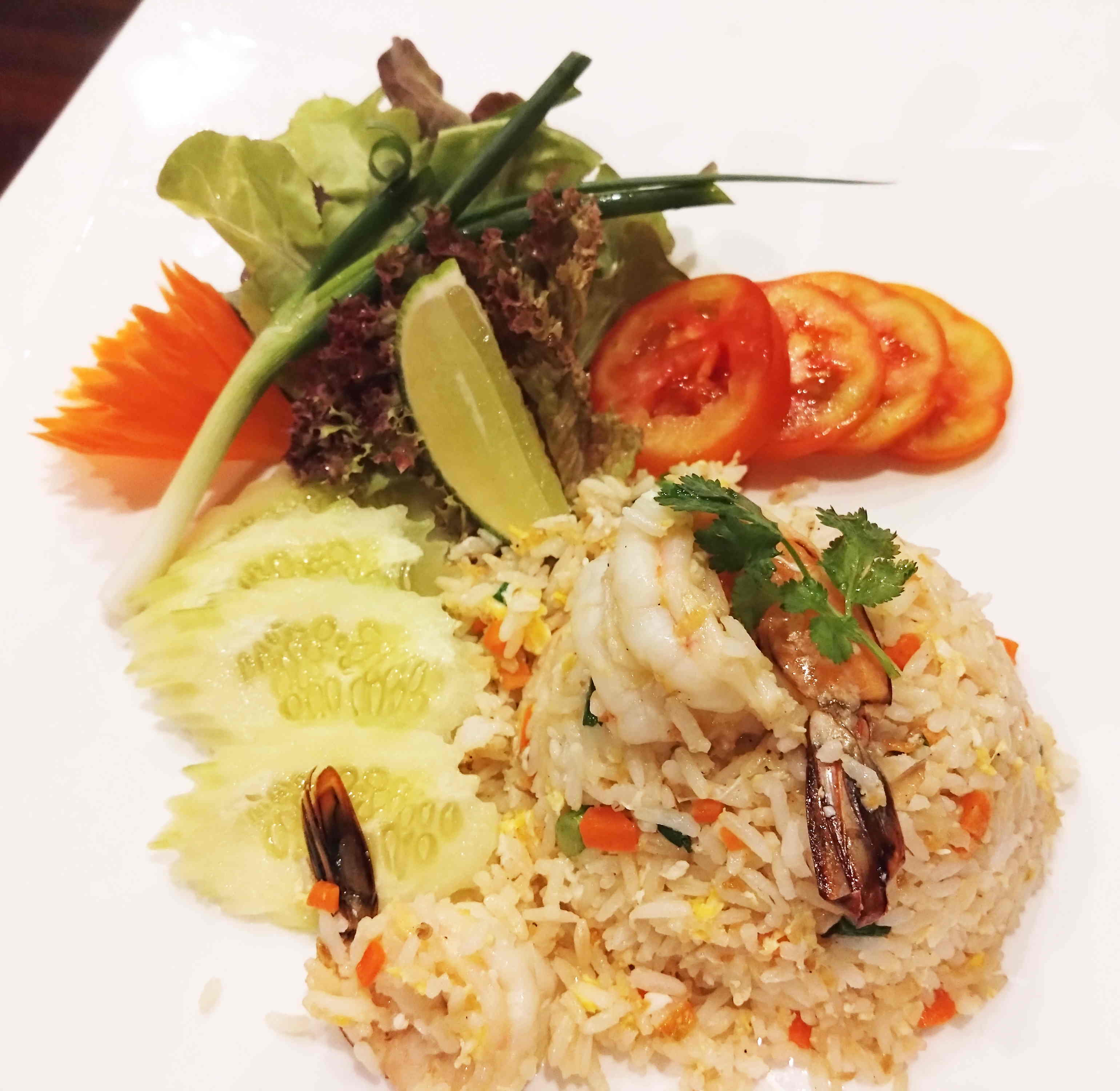 ありがたかったのは「カオパット」といういわゆるタイ式チャーハンがあったこと。ナンプラーなどは好みで各自で入れるようで、私がいくつか食べたものには「臭み」はありませんでした。下の「カオパット」はいずれもホテルのレストランのものです。写真を撮り損ねましたが、ムアンボーランの食堂で食べた海老チャーハンは、海老も大きいのがけっこう入っていたし、日本人の味覚にとてもマッチして、今回食べたタイの食事の中で最高でした。