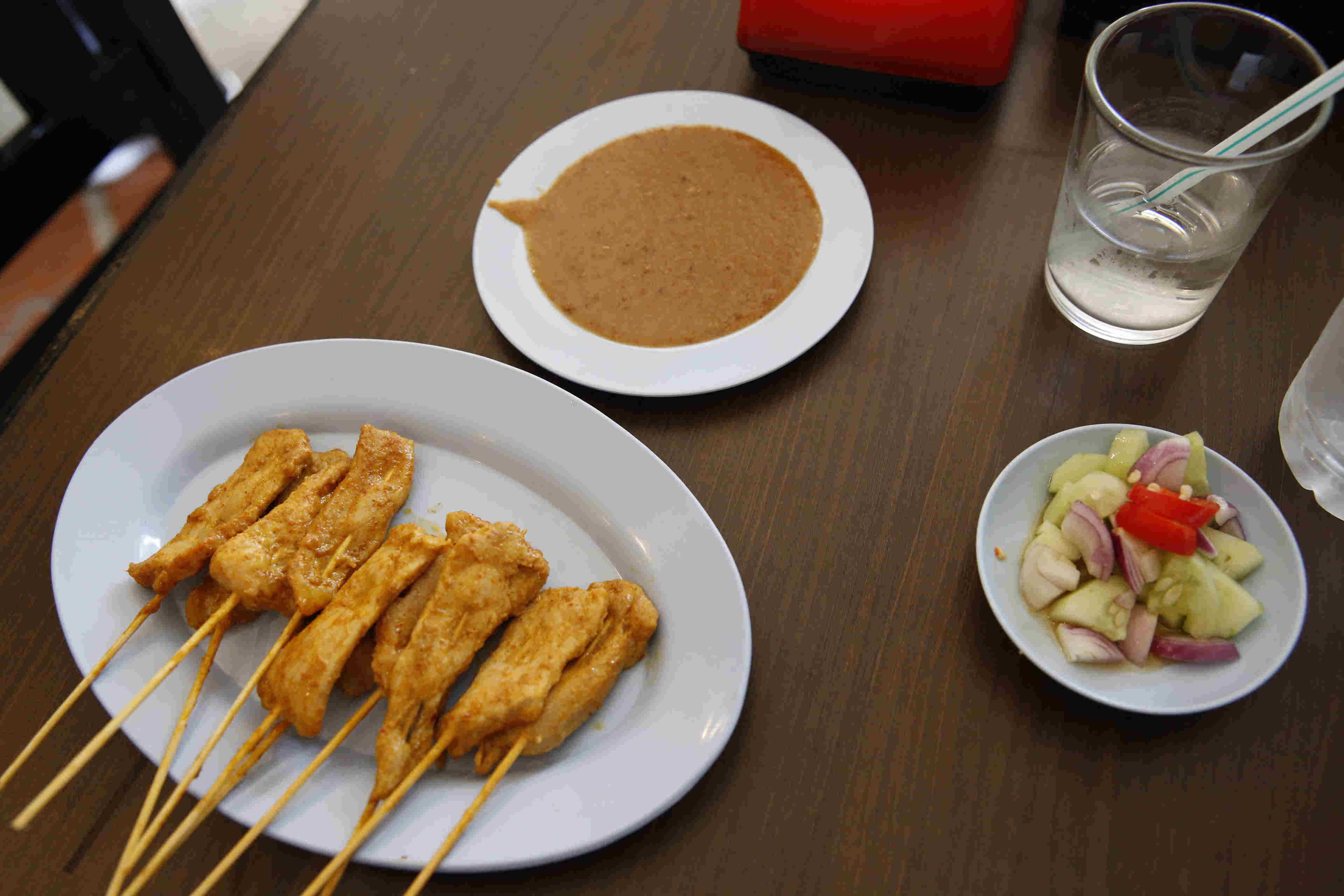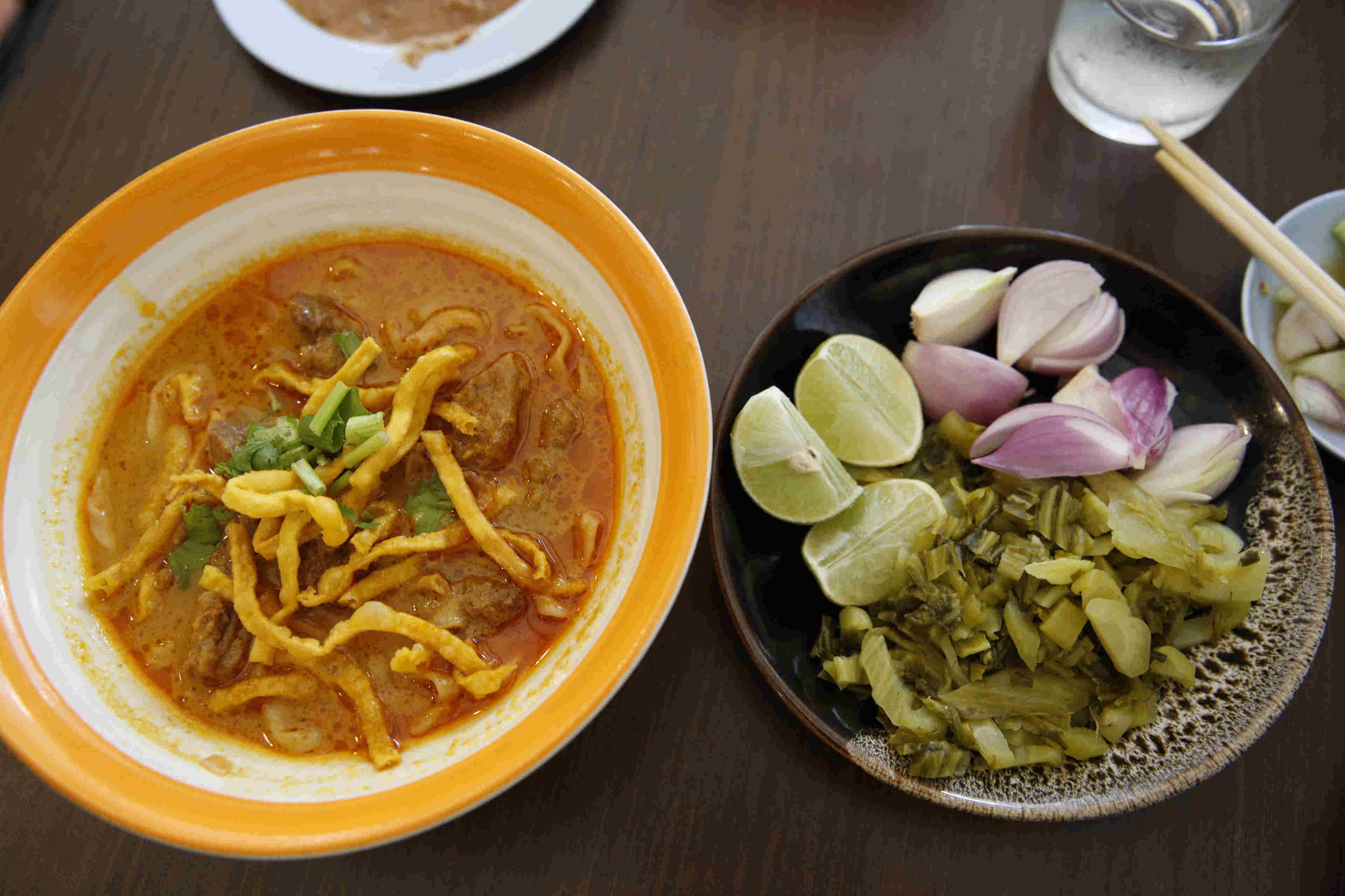 左はチェンマイ名物と言うカレーラーメン。全く臭くは無く、そんなに辛くもありません。付いてきたライム、玉ねぎ、タイ式漬物(ナンプラー臭なし)などで味を整えます。右は豚の焼き串。甘辛いタレが塗ってあり、さらに甘じょっぱいピーナッツ味噌のようなものを付けて食べます。これはまずまず美味でした。