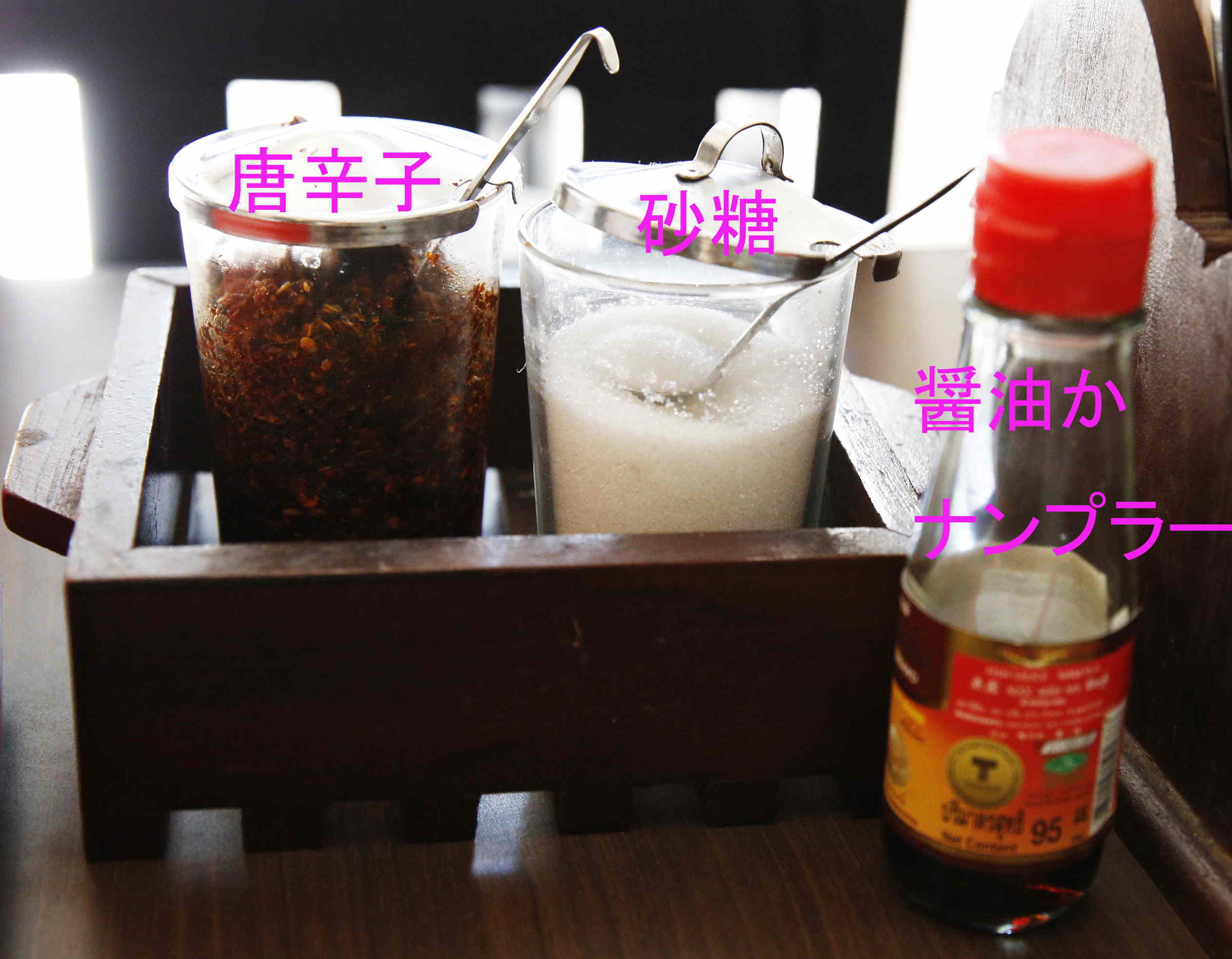 タイの普通の人が利用する食堂、レストランの食卓を見て、タイ人のソウル(soul)味の根源が少し分りました。まず、ほとんどの食卓に置かれているのが、何と砂糖(もちろん甘味用)、唐辛子を細かく刻んだもの、あるいは酢につけたもの(もちろん辛味、酸味用)です。そして、ナンプラー(塩味用)や醤油(日本のものから旨味を取ったようなもの。にんにくや野菜エキスを加えた「玉子料理用」のものもあった)。各自で好みの味にします。昔、日本の町中華の店で、野菜炒めライスにギョーザ用ラー油と酢を掛けて食べている外国人を見ましたが、あれはタイの人だったのでしょうか? 強烈な思い出の一つです。次にいくつかの店のテーブルに置いてあった調味料を紹介します。
