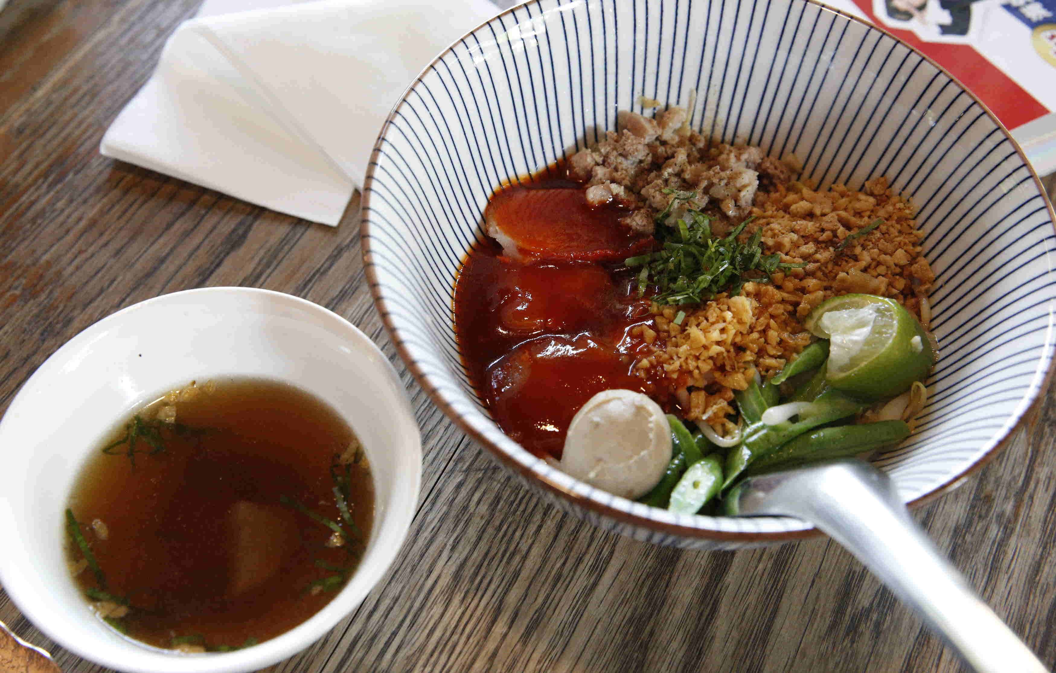 上の具に隠れているが、米粉の五目麺、といったところか。たしか醤油味。甘辛タレの付いた豚肉、鳥ひき肉、ピーナッツなどが入り、具とかき混ぜて食べる。好みでライムで味付けする。これも「ナンプラー臭」無し。スープの出汁は日本のラーメンのように鳥獣の骨肉で撮るとのこと
