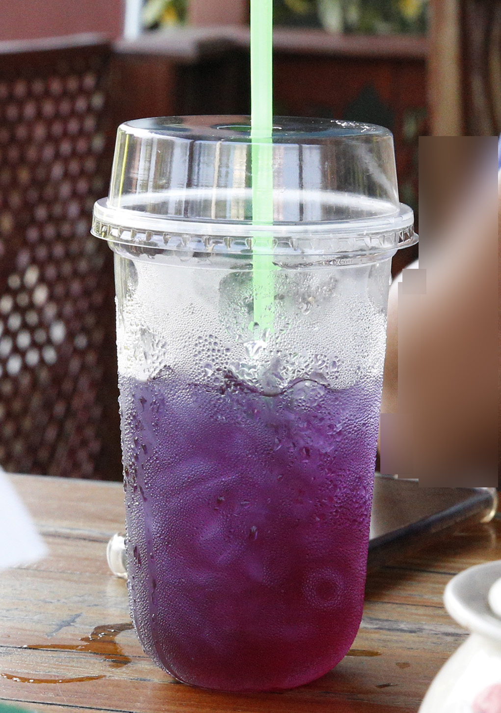 左はタイ式ティー・ミルク入り。右はバタフライピーというマメ科の紫色の花のエキスの飲み物。真っ青の花もあり、ともに老化防止、薄毛、白髪予防の効果もあるとか。日本でこのティーを探してみよう!