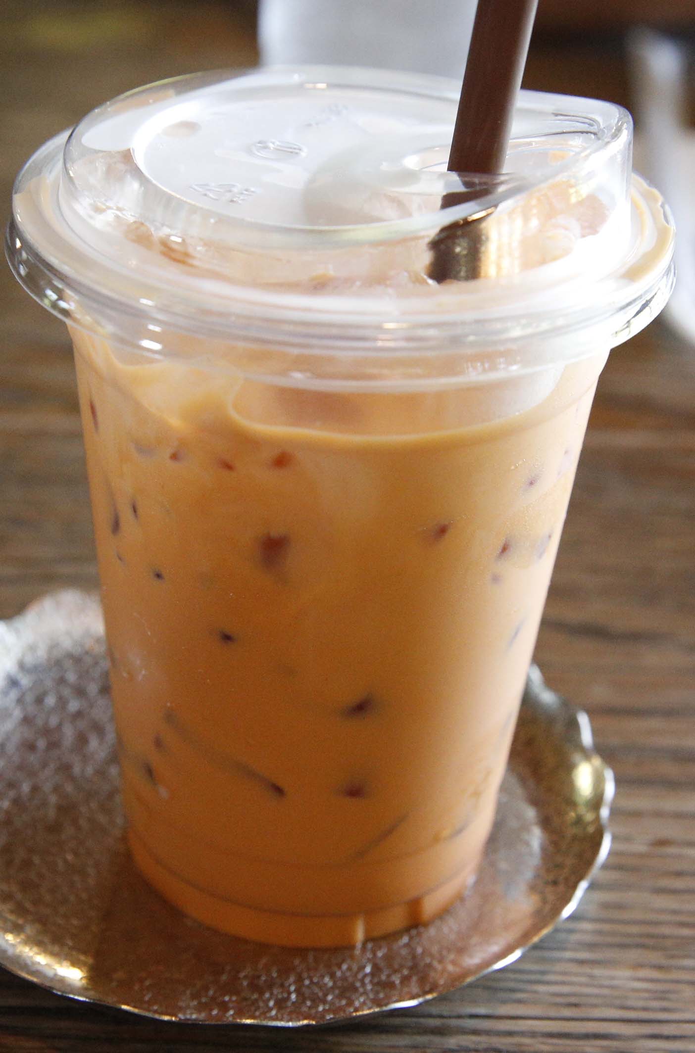 それで氷だけは避けようと思っていましたが、現地日本語ガイドが「衛生管理を厳しく指導されたのでもう大丈夫。」と言い、毎日30℃を越す暑さで汗もかいていたので、意を決して冷たい飲み物(ほとんど皆砕いた氷が入っています)を何回か飲みました。タイの人は辛い料理を食べるためか、半面とても甘いものが好きです。ホテルのレストランで食べたチャーハンも日本の普通のものよりも甘みが強かったです。だから飲み物も氷を入れてちょうどいい甘さになるようです。幸い、私は「超特急」になるどころか、「準急」にも全くなりませんでした。まさに暑さから私を救ってくれた「菩薩」(上座部仏教の国には本当はいませんが、私は大乗仏教の国の者なので、敢えてそう呼ばせてもらいます)となった氷!! 飲んだもので写真を撮ったのは次の二つ。