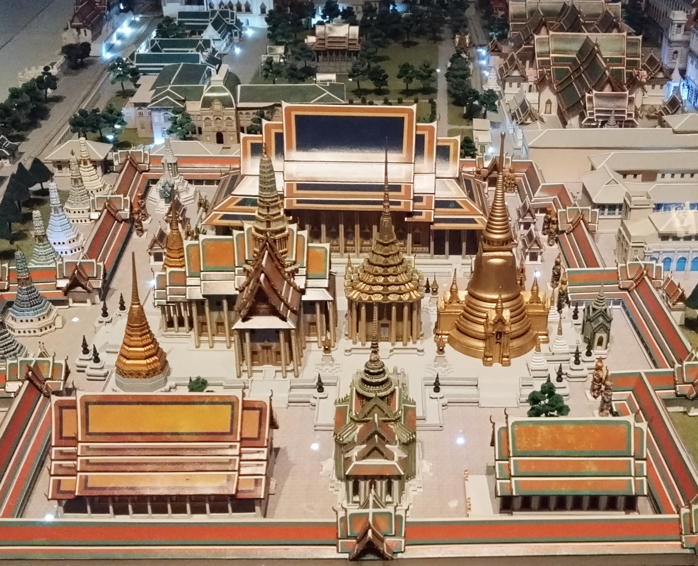 ワット・プラケオの型の真ん中にある大きな三つの塔。右からスリランカ式、モンドップ式、クメール式(屋根の上の塔のみ)(バンコクのRattanakosin Exhibition Hall(ホール)の展示より。撮影は自由ですが、2時間くらいの館内英語ガイドツアーに参加し、その途中でこれにお目にかかるのが前提条件です。)