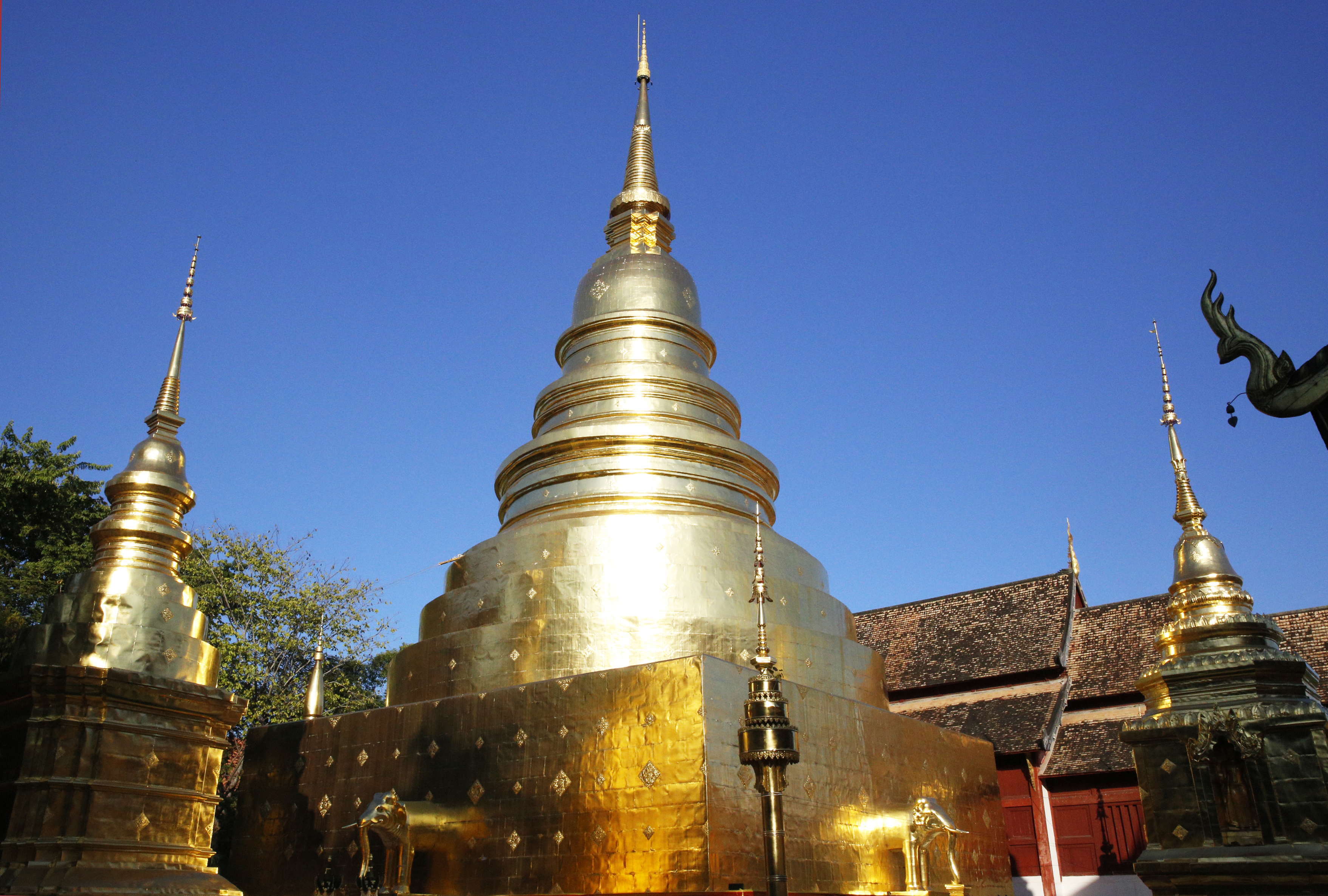 左はチェンマイのワット・プラシン。下方の象にも注目。右はチェンラーイの「白い寺」。