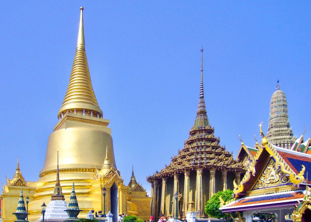 実際のワット・プラケオの中央の塔と塔状宝塔。2023年末では真ん中の塔状宝頂を持つ大経蔵プラ・モンドップは修理中でこの写真はフリー素材より。