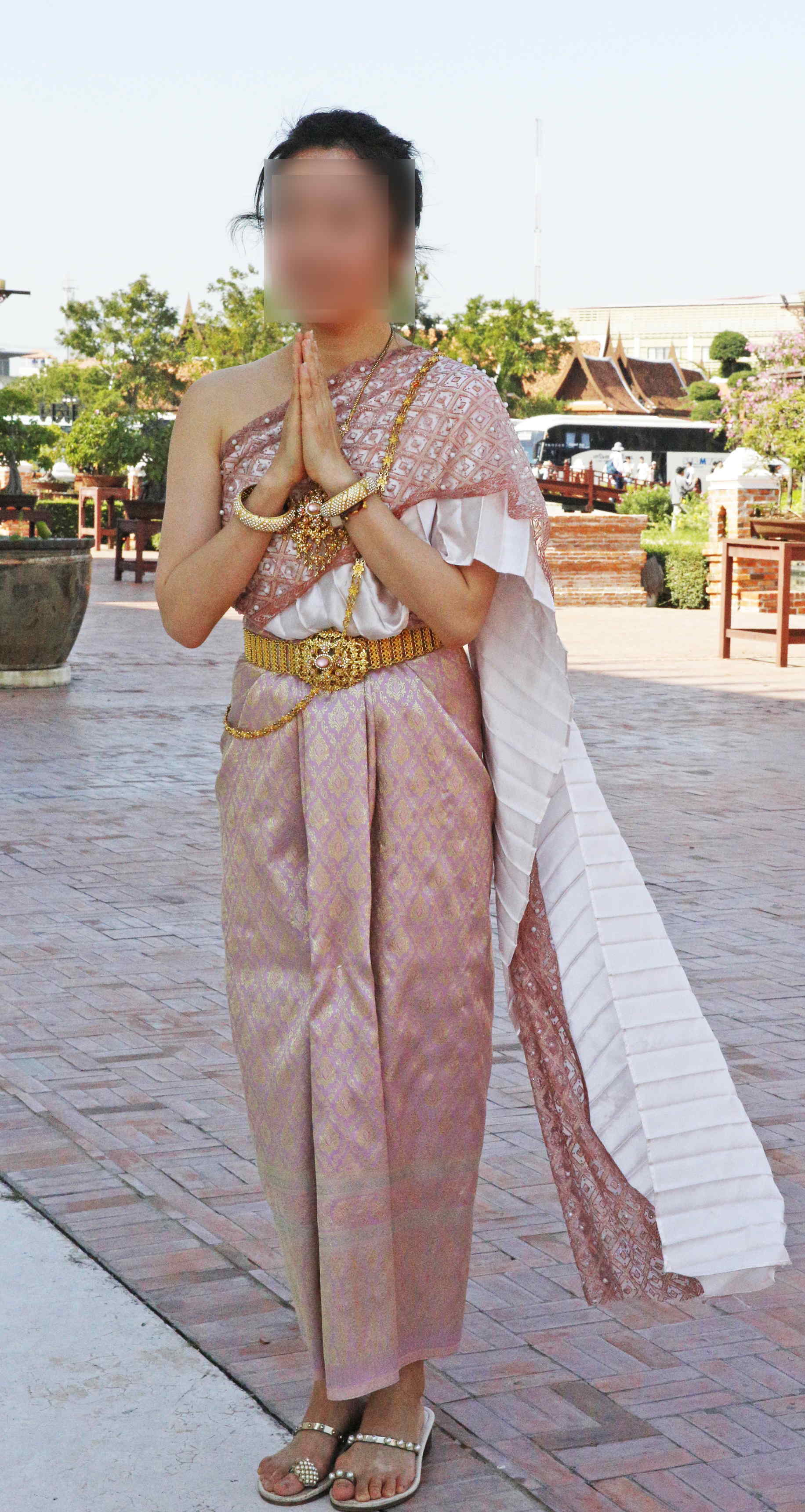 (https://belcy.jp/58711 「タイの民族衣装について!男性・女性の伝統衣装は?着用シーンも 」より)「『タイのドレス』」という意味のチュッタイは、婚礼衣装としても用いられる正装です。スカートとしてはく筒状の布バー・ヌンは、正面にプリーツを寄せてはき、金銀細工の飾りバックル付きのベルトで締め上げます。上にビスチエなどを着て、仕上げに肩布のサ・バイを羽織ります。」