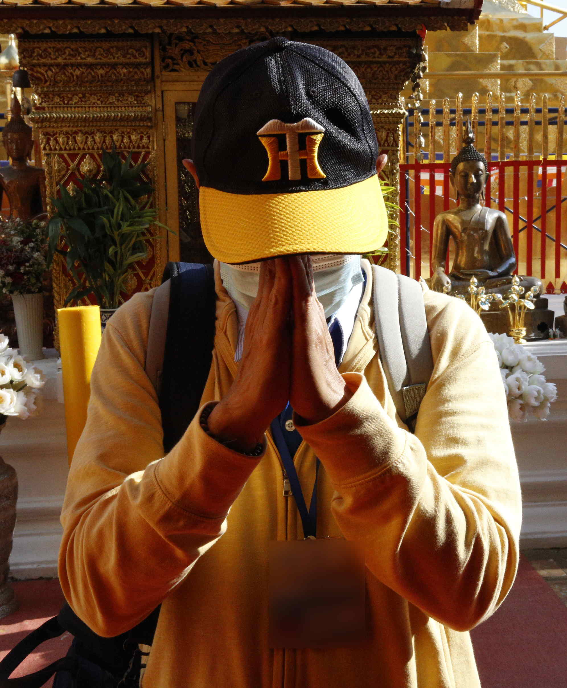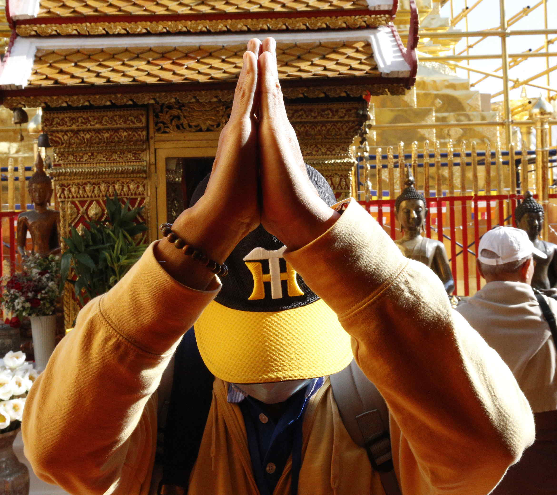 タイでは、日常的に合掌(ワイ)をして挨拶し、相手に敬意を示しています。ガイドに教えてもらったのは、相手によって高さを変えるということでした。以下、ガイドの実演によって示してみます。なお、この方はタイ人ですが熱烈な阪神タイガースファンだとのこと。ワイは手のひらをぴたっと合わせるのではなく、蓮の花の蕾の形を作るようにするのが正しいとのこと。目下の者から先にします。