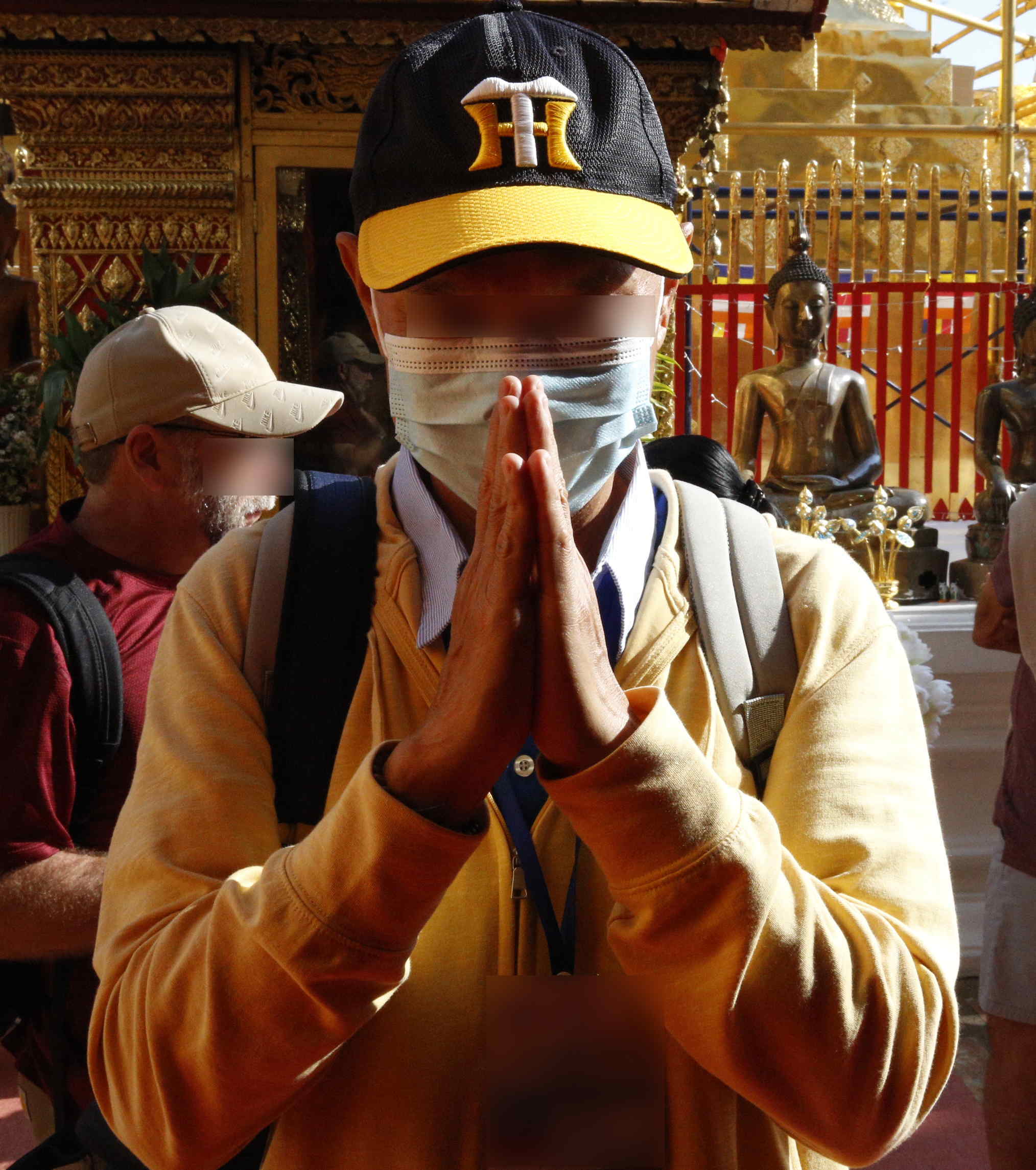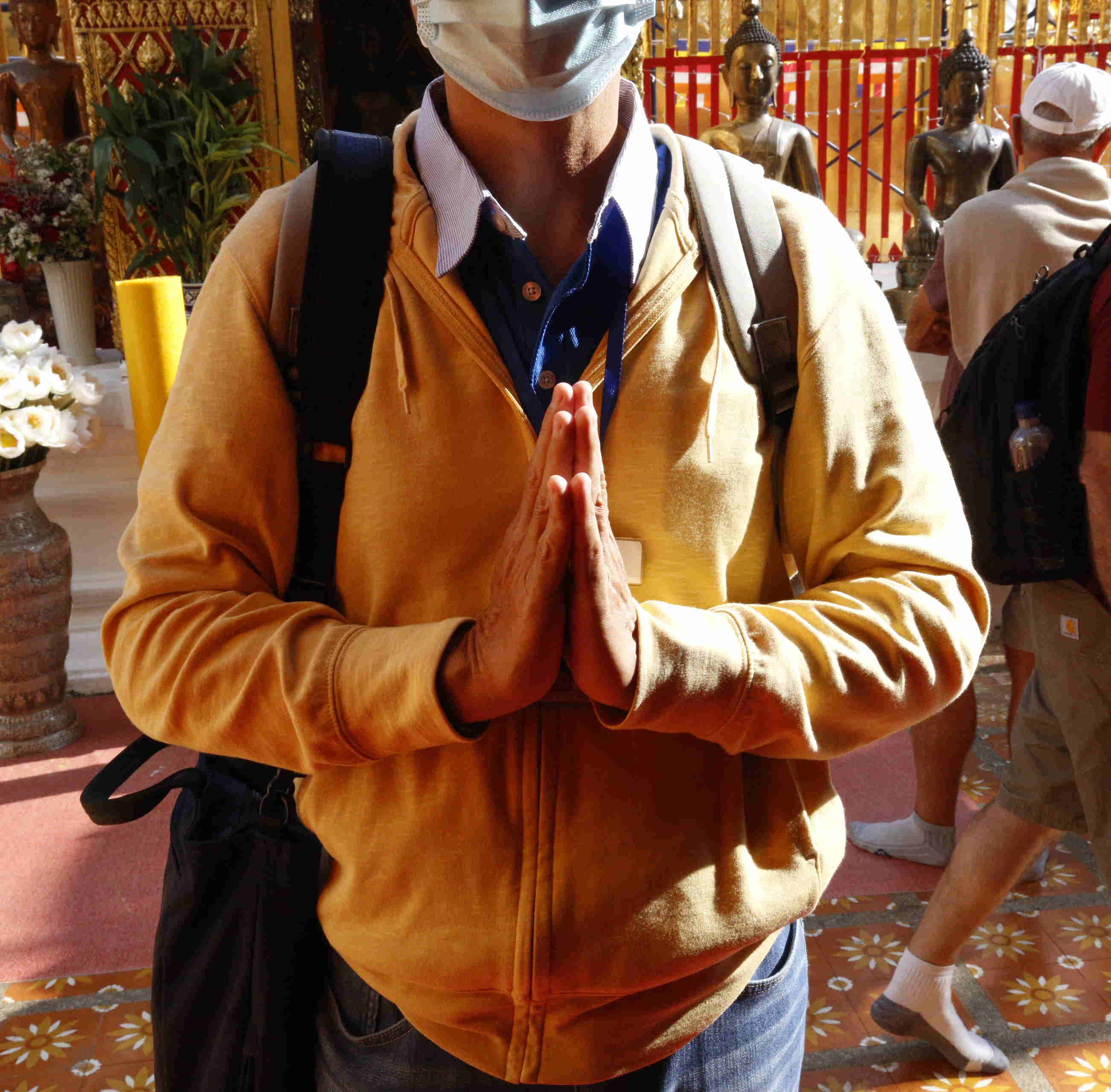 左は手の先が顎より下で、相手が同年代または少し年上の人に対して。次は手の先が鼻のあたりで、尊属、先生など目上の人に行う。そして右の二つは仏像や僧侶などに行うもので、手の先は眉間の高さに置き、拝礼も伴う、というもの。なお、このガイドさんは、本当は多人数のツアーのための人なのだが、結果として私一人だけの個人ツアーとなったのに、このように一生懸命やってくれました。私について、どこでどう手違いがあったのか、「女性」だと登録されていたのに、男性だと分って、少しがっかりしたと思いますが、それでも全力でガイドしてくれました。