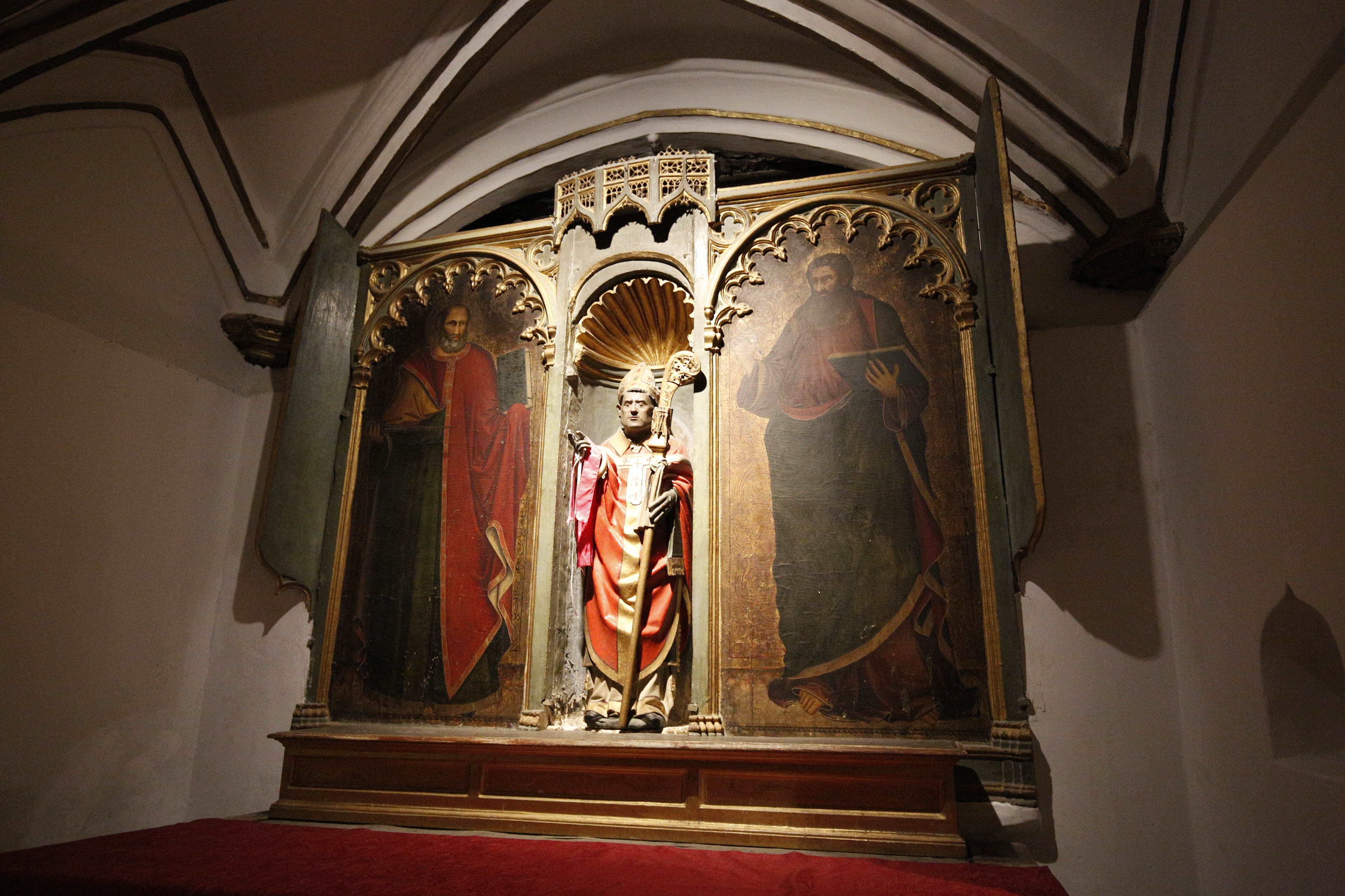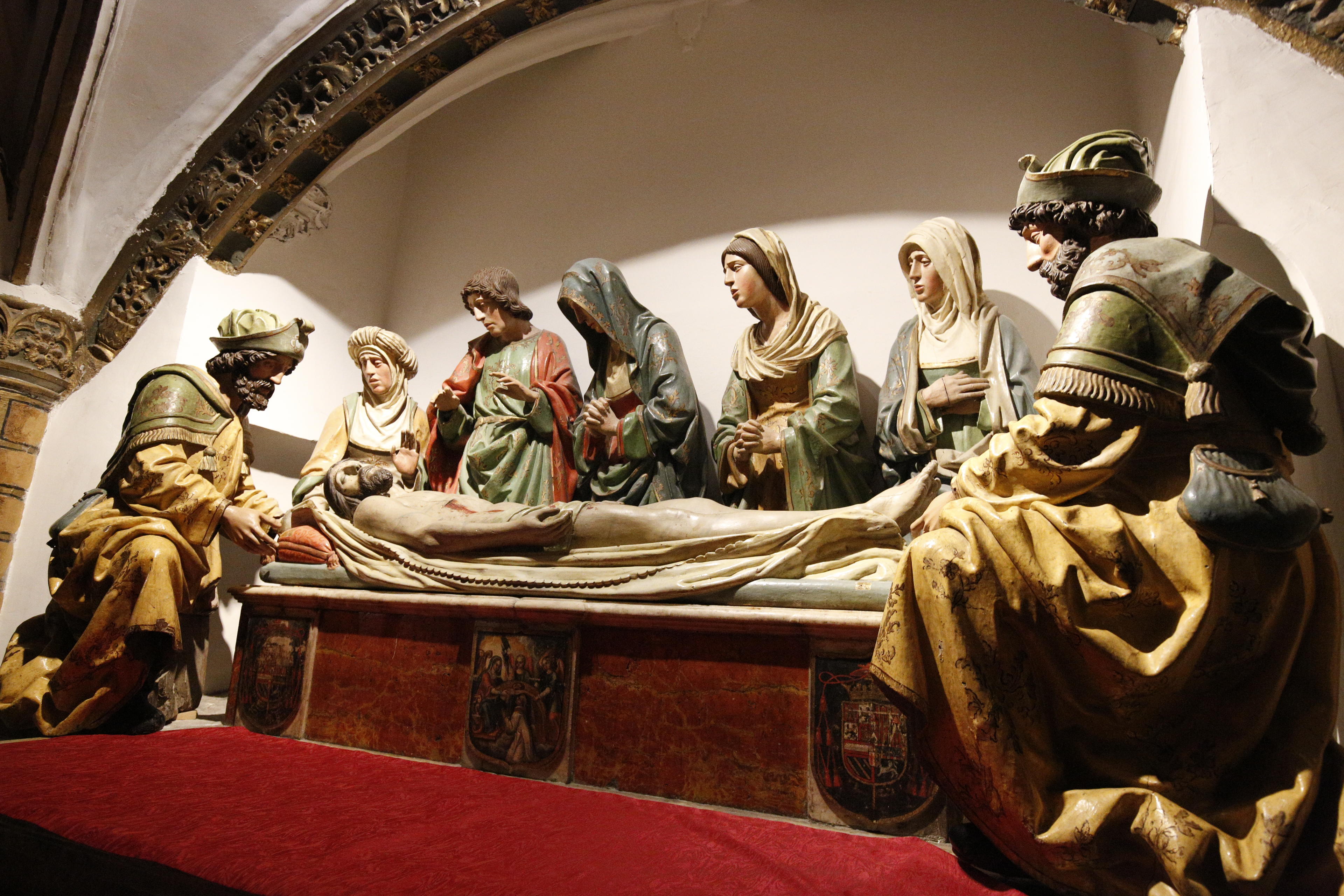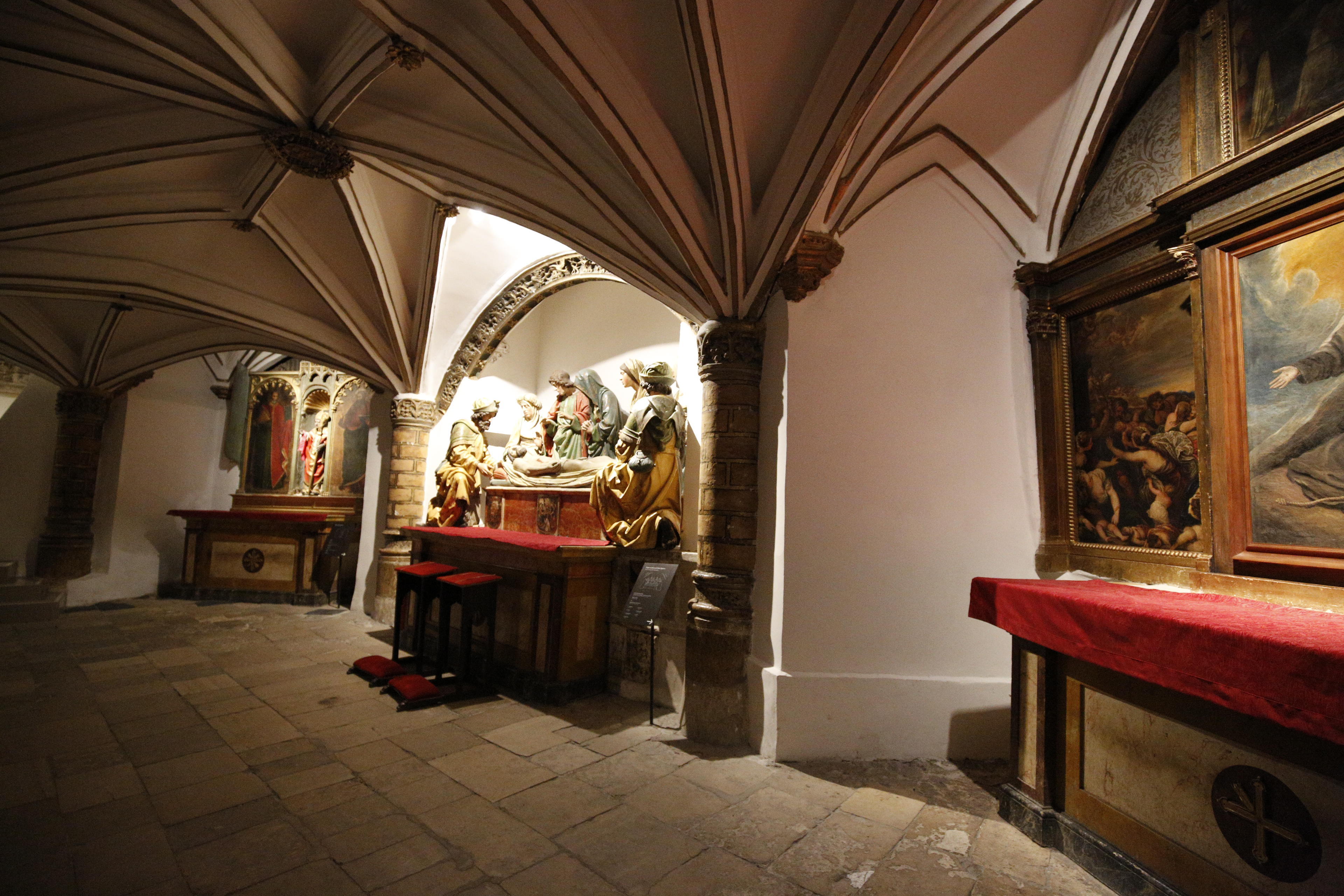 主祭壇の地下にある礼拝堂で、公開されている。「パスクアル・デ・アラゴン枢機卿(1666-1677)は、弟アントニオ・デ・アラゴンの妻フェリア公爵夫人からの寄贈によってトレドにやってきた聖ウルスラ(※1)の遺骸を納めるために、大聖堂に適切な空間を作ることを決意した。枢機卿は、このためにガラスと木製の骨壷を作らせ(枢機卿の紋章が封印されている)、それまで教皇クレメンス10世が所有していた聖女の遺骨を納めた。 この貴重な棺は、ディエゴ・コピン・デ・ホランダ(※2)が制作し、フアン・デ・ボルゴーニャ(※3)が彩色を施した「キリストの聖葬」と呼ばれるユニークな彫刻のすぐ前にある地下聖堂の中央祭壇に安置された。 このシーンでは、マリア、三人の聖女、聖ヨハネが、ニコデモとアリマタヤのヨセフが持つシーツの上に横たわるキリストを、祈るような姿勢で見つめている様子が描かれている。・・・地下礼拝堂の装飾は、2つの三連祭壇画で完成している。そのうちの一枚は、左側にあり、司教聖ユリアヌス(※4)が、聖バルトロマイと聖ヨハネ(2人とも十二使徒の一員)に挟まれて描かれており、二枚目には、アッシジの聖フランチェスコ(※5)が聖痕を受け、無辜の民の斬首(※6)と洗礼者聖ヨハネが添えられている油絵が描かれている。」