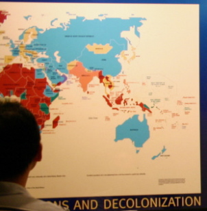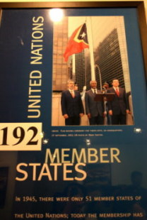 ついで、植民地の独立のパネル展示があり、また、植民地の独立とともに国連加盟国も増えたことが示され、2006年8月時点で192カ国でした。192番目はモンテネグロ。今後の加盟国増加にそなえて国数は貼紙です(なお、下の展示されていた写真は191番目の加盟国、東チモール民主共和国の加盟時のものです)。![]()