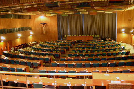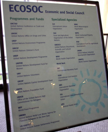 さらに、経済社会理事会へ。この部屋はスウェーデンからの寄贈。天井の一部がありません。「経済社会の発展の任務に終わりがない」ことの象徴としたとか。廊下には、下部機関や専門機関の紹介がありました。