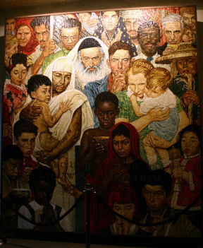 さらに進むとモザイク画がありました。国連創立40年を記念し、USA大統領レーガン夫人より、寄贈されました。アメリカの芸術家、ノーマン・ロックウェルによって描かれた「黄金律」(あなたのしてほしいことを人に施しなさい)がテーマで下の方に文字が書かれています。このモザイク画はベネチアの芸術家によって制作されたとのことです。