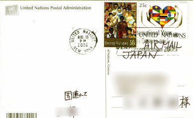 国連旗マークのデザインをモチーフにした様々なグッズや、各国のいろいろな土産を売っていました。やはりこれがThis is Japan.ですか。私は国連旗のガラスの置物と折り畳み傘を買いました。授業のとき広げてやりましょう。私宛に出した葉書はちゃんと届きました。