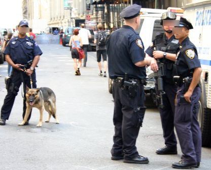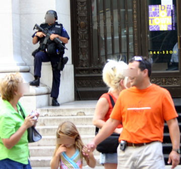 街中の警備の厳しさは特に感じませんでしたが、イギリスの液体テロ情報があった後、ニューヨークのウォール街、証券取引所近辺に行ったら、下のようにマシンガンで警備する人を見ました。