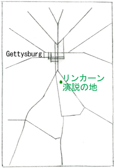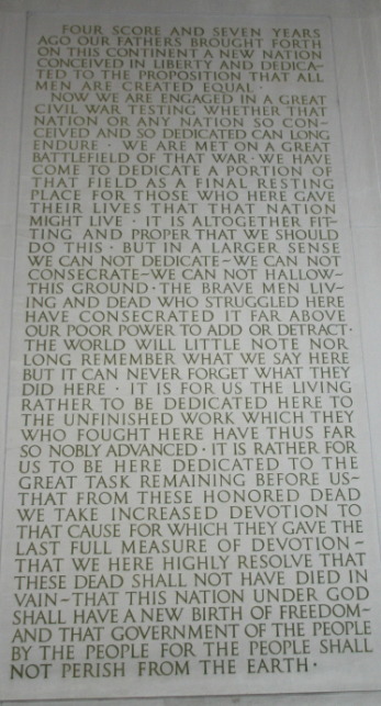 リンカーンの演説は、「87年前(1776年)、自由と民主主義を理念とする国が誕生したが、今その存亡の危機にある。このゲティスバーグで戦死した者たちの意志を受け継いでいく決意をしなければならない。人民の人民による人民のための政治を地上から消してはならない。」という旨を2分半ほどの短時間にまとめたものであった。
